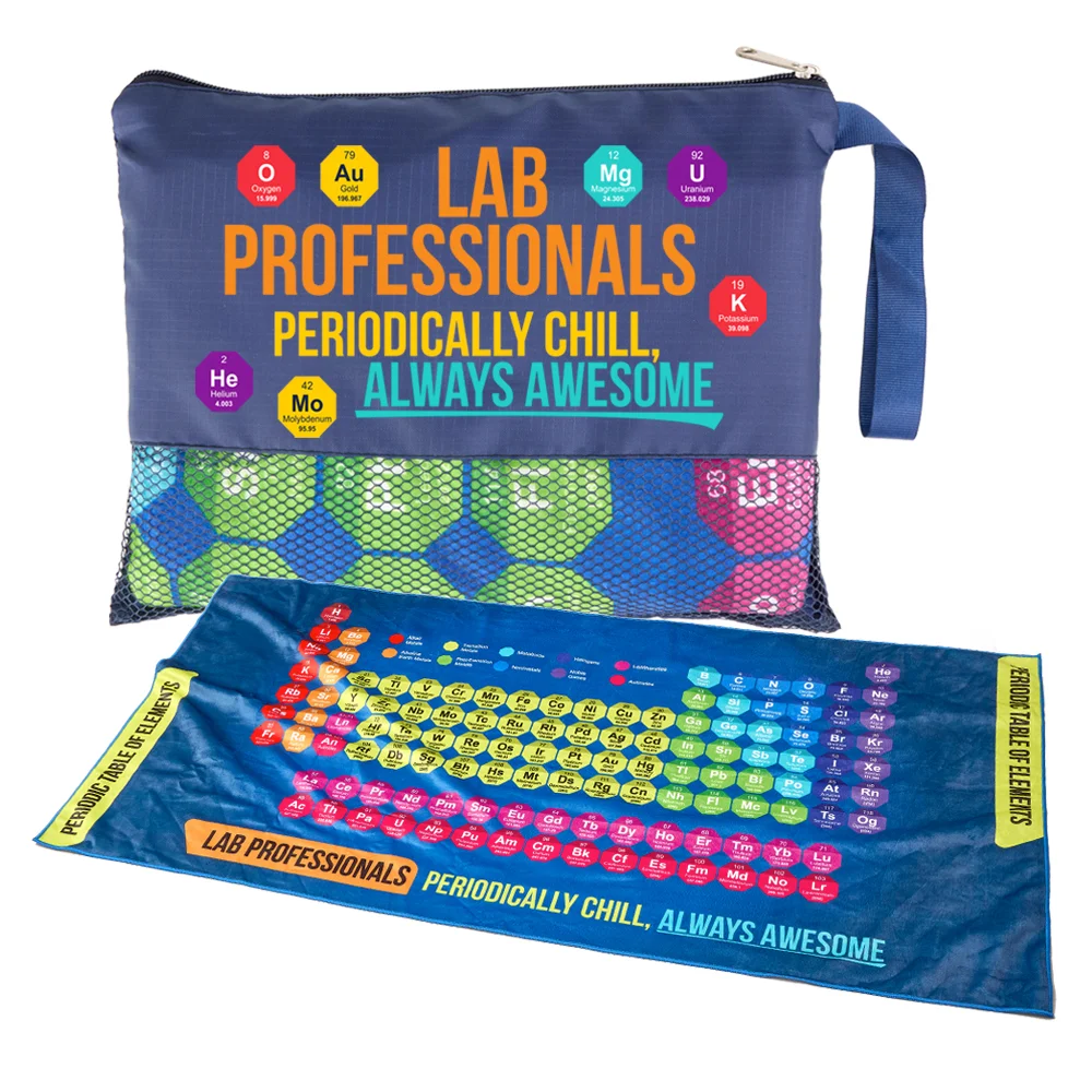 Beach Towel: Periodic table design is sure to appeal to your team; Ultra-soft terry cloth is soft and absorbent; Microfiber polyester front with terry back; Hemmed; 55% polyester / 45% cotton; Handy mesh bag included