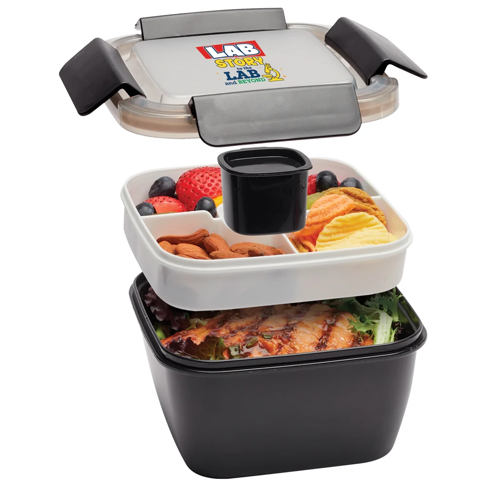 • Stacker Container: Two plastic, rectangular stacking containers with a hinged, locking lid; Fork included; Airtight lid with silicone ring seals in freshness and prevents spills; Large bottom container holds 68 oz. (8.5 cups); 4-compartment top tray (2 sections hold 5 oz., 2 hold 3.5 oz.) separates snacks; Lidded, removable 3-oz. container stores dressing, toppings, or sauces; Eco friendly; Reusable; BPA free; Note: Microwave and freezer safe; Dishwasher safe after lid and compartments removed