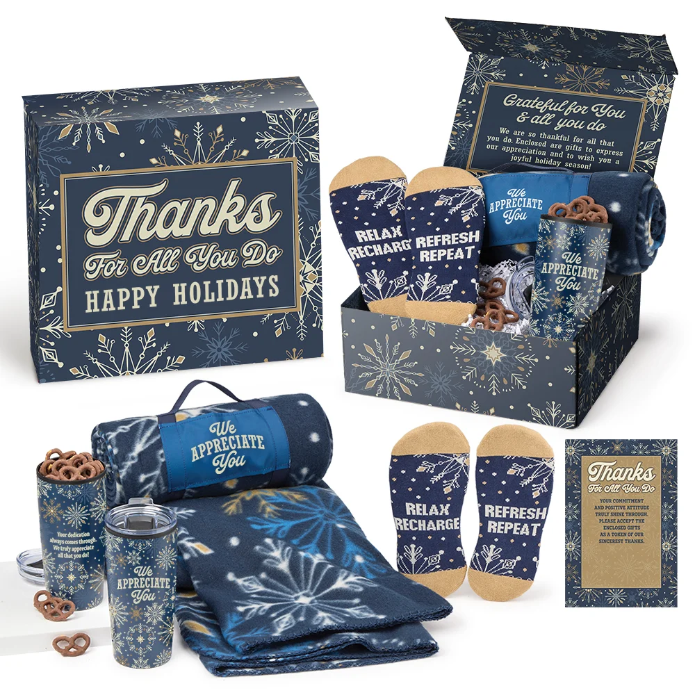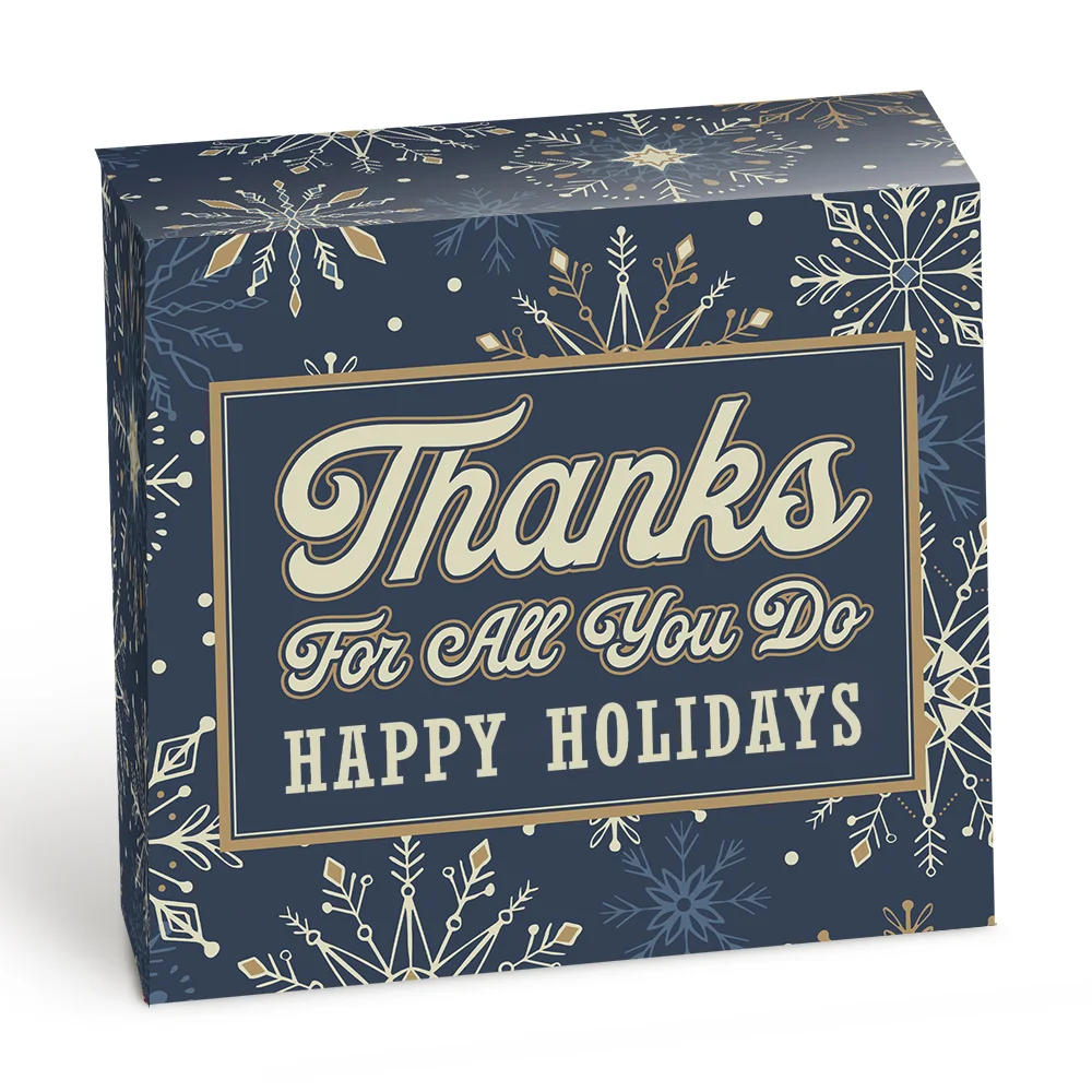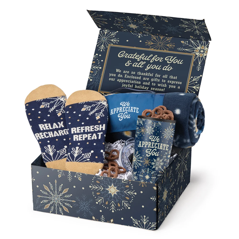 Holiday gift box included; Message inside lid: We are so thankful for all that you do. Enclosed are gifts to express our appreciation and to wish you a joyful holiday season!