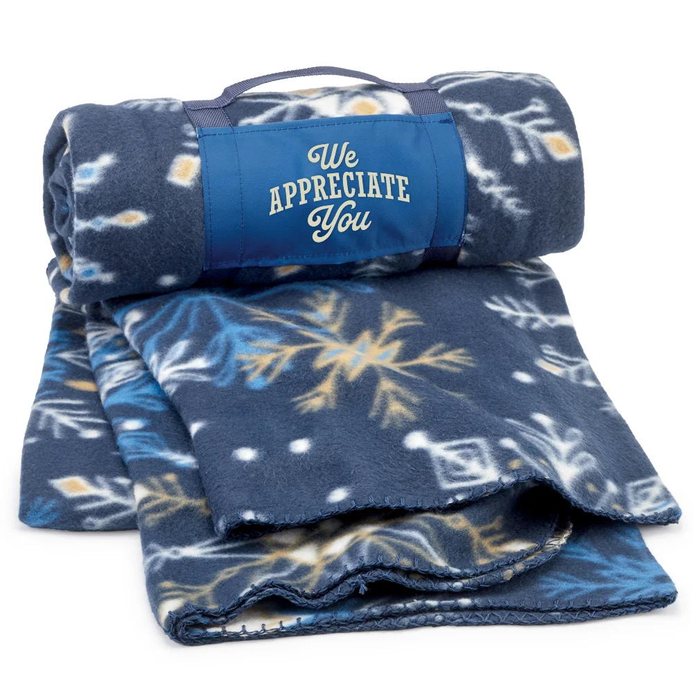 Blanket: Compact roll-up blanket makes it easy to grab a quick nap at break time or to enjoy cozy warmth any time; 340-g., 190-gsm., 100% recycled polyester microfleece is soft, durable, and machine washable; Keep comfy indoors or out, wherever and whenever a little extra warmth is needed; Rolls up and secures with removable straps for easy portability; Eco friendly; Recycled materials; 60" x 48" unfolded