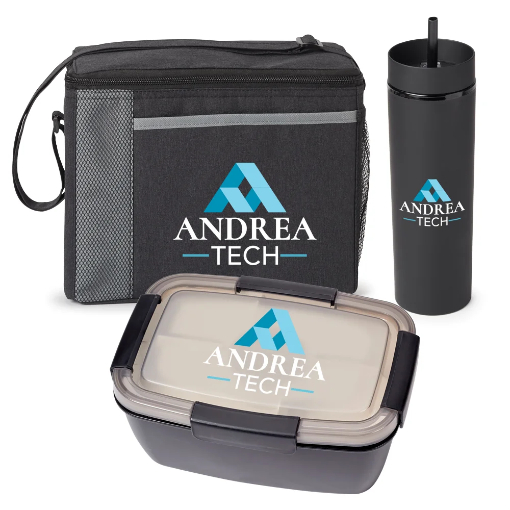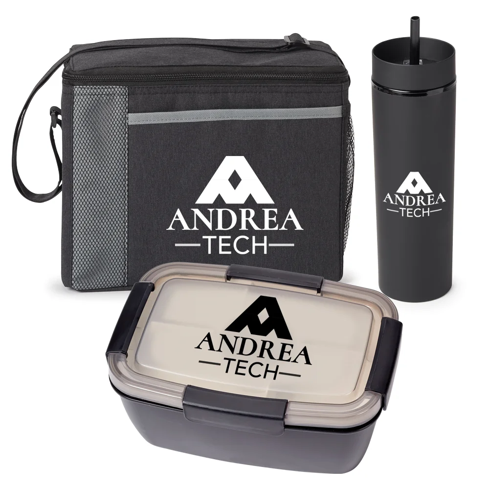 3-piece gift set includes: Canyon 2-in-1 Tumbler & Sipper 16 oz., Grayson Lunch/Cooler Bag, & Locking Stacker Food Container 68 oz.