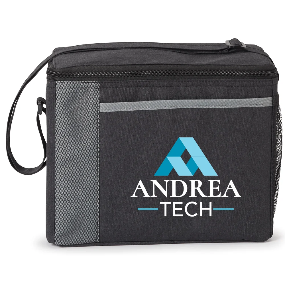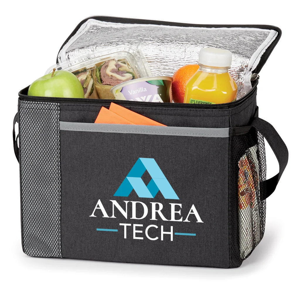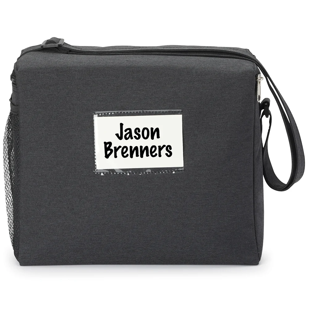 Personalized Lunch/Cooler Bag: Reusable bag that keeps contents fresh on the go; Flip-top lid with zip-around closure; Two zipper pulls for full access to large compartment; Front slip pocket for utensils or small essentials; Side mesh pocket stores even more; Insulated lining is easy to wipe clean; Strap adjusts for hand or shoulder carry; ID window on back; Holds up to 8 cans; Heathered 300-denier polyester with contrast trim