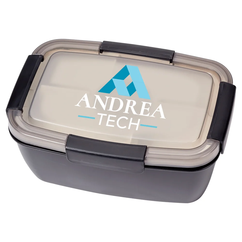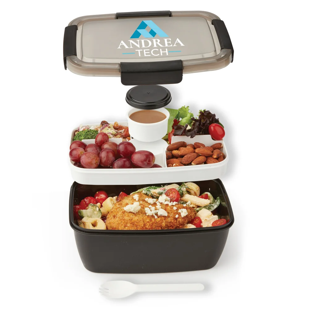 Personalized Stacker Container: Two plastic, rectangular stacking containers with a hinged, locking lid; Fork included; Airtight lid with silicone ring seals in freshness and prevents spills; Large bottom container holds 68 oz. (8.5 cups); 4-compartment top tray (2 sections hold 5 oz., 2 hold 3.5 oz.) separates snacks; Lidded, removable 3-oz. container stores dressing, toppings, or sauces; Eco friendly; Reusable; BPA free; Note: Microwave and freezer safe; Dishwasher safe after lid and compartments removed