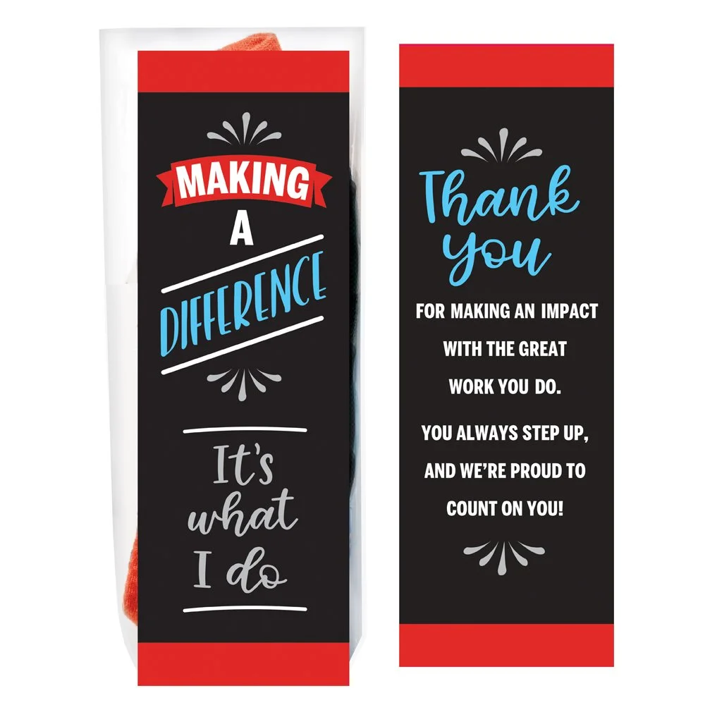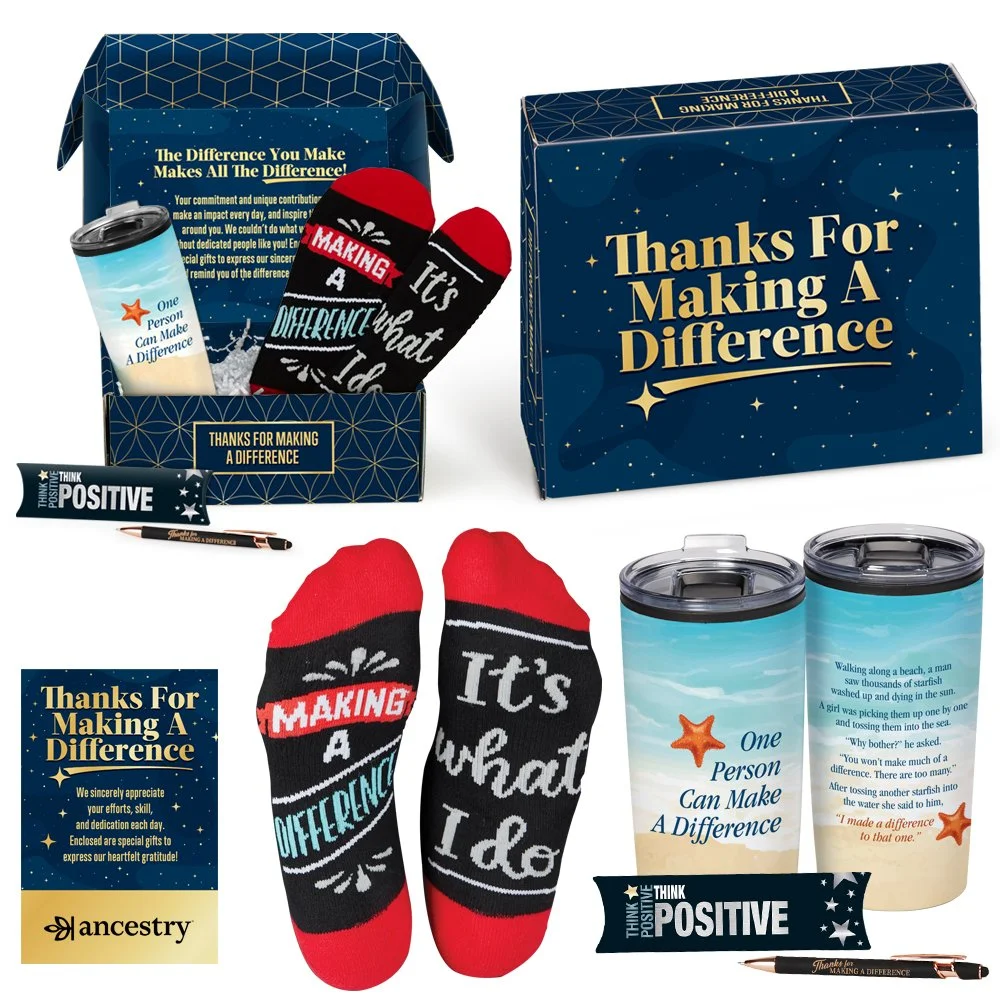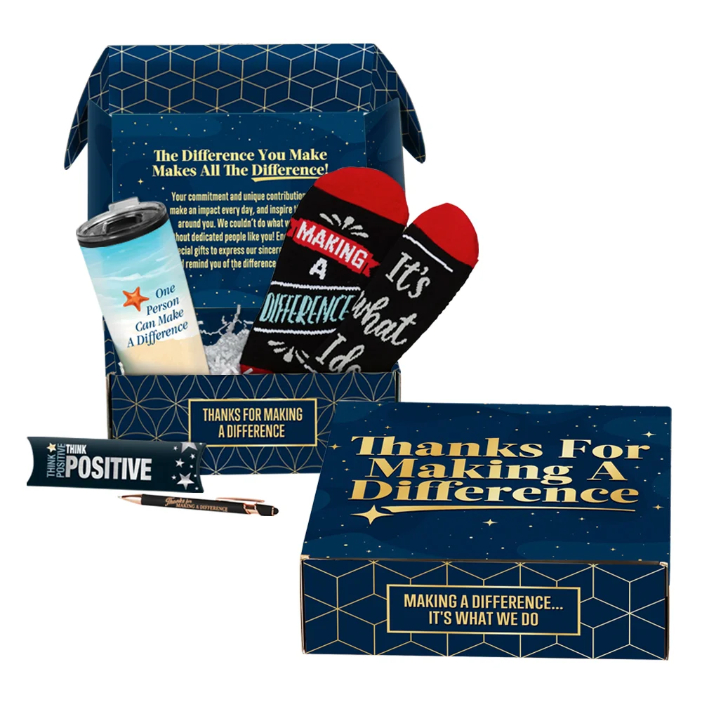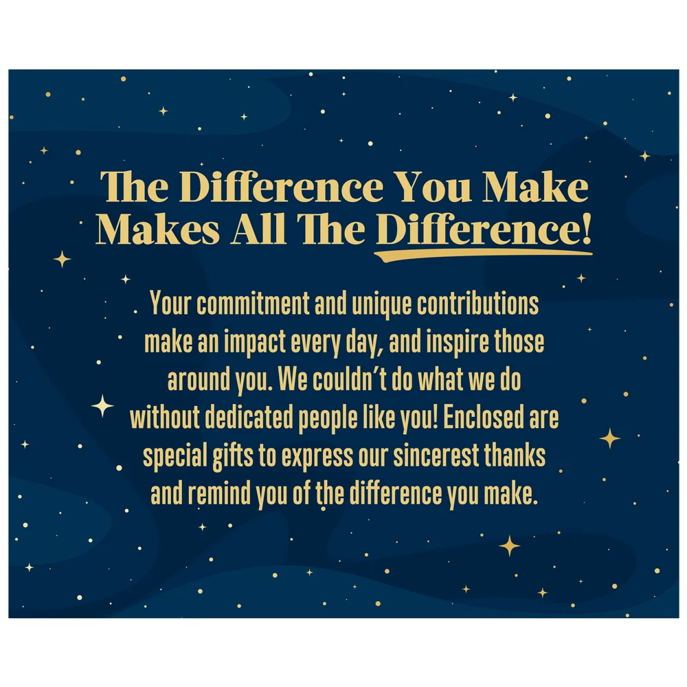 Gift box included; Message inside lid: The difference you make makes all the difference! Your commitment and unique contribution make an impact every day, and inspire those around you. We couldn't do what we do without dedicated people like you! Enjoy these special gifts to express our sincerest thanks and remind you of the difference you make!