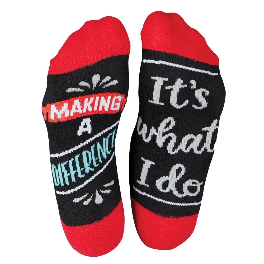 Ankle Socks: Cotton blend; Thick, cushioned soles offer comfort and relief after a long day; Color-accented heel & toe; Design on soles can be read when recipients put up their feet to relax; Each pair comes polybagged with a FREE appreciation card; One size fits most