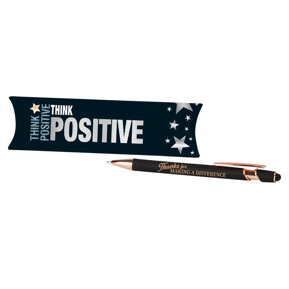 Stylus Pen: Premium metal stylus pen with metallic, rubberized, satin finish in black with elegant rose-gold trim; Matching-color stylus tip navigates touchscreens and keeps them smudge free; Click-action ballpoint; Black ink; Pillow gift box included