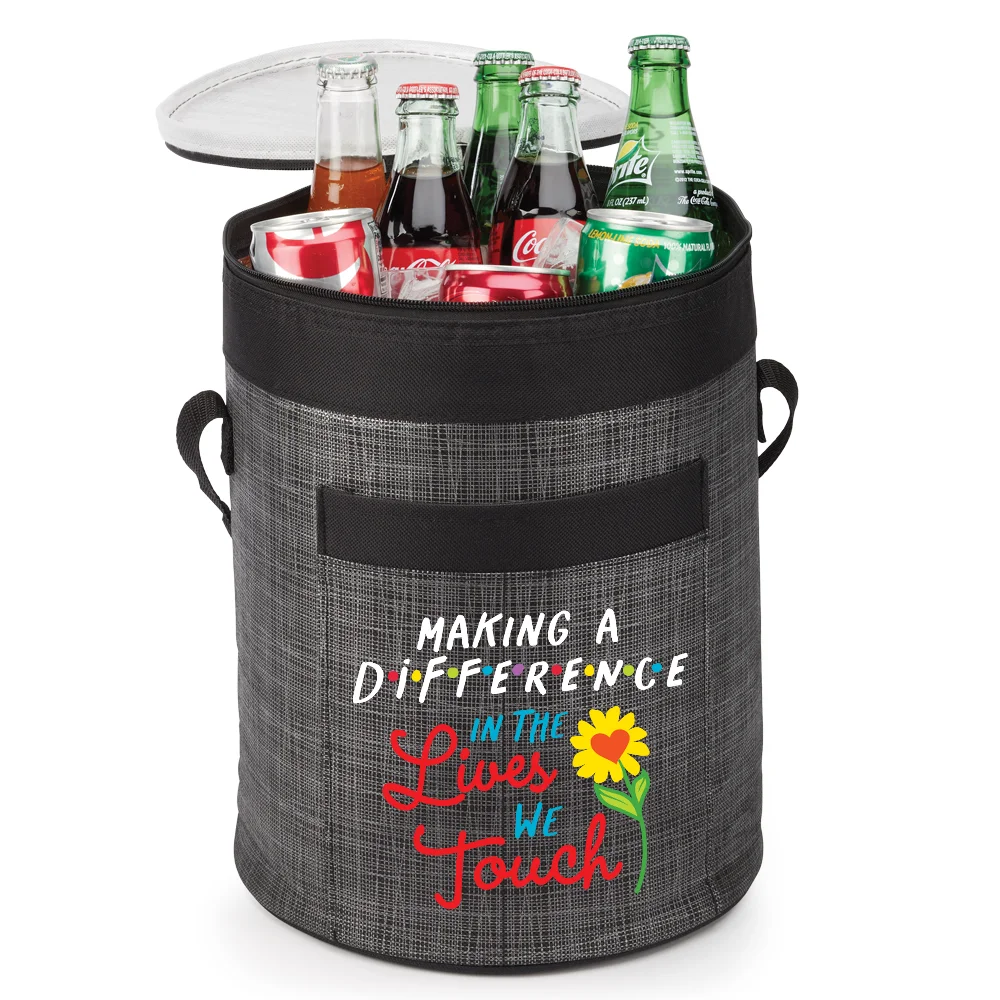 • Cooler Bag: Roomy, zip-shut, barrel-shaped, insulated cooler; Holds up to 16 cans plus ice; Exterior pocket for napkins and quick-grab items; 19 1/2" carry strap; Folds flat for easy storage; 80-gsm. non-woven polypropylene/600-denier polyester trim