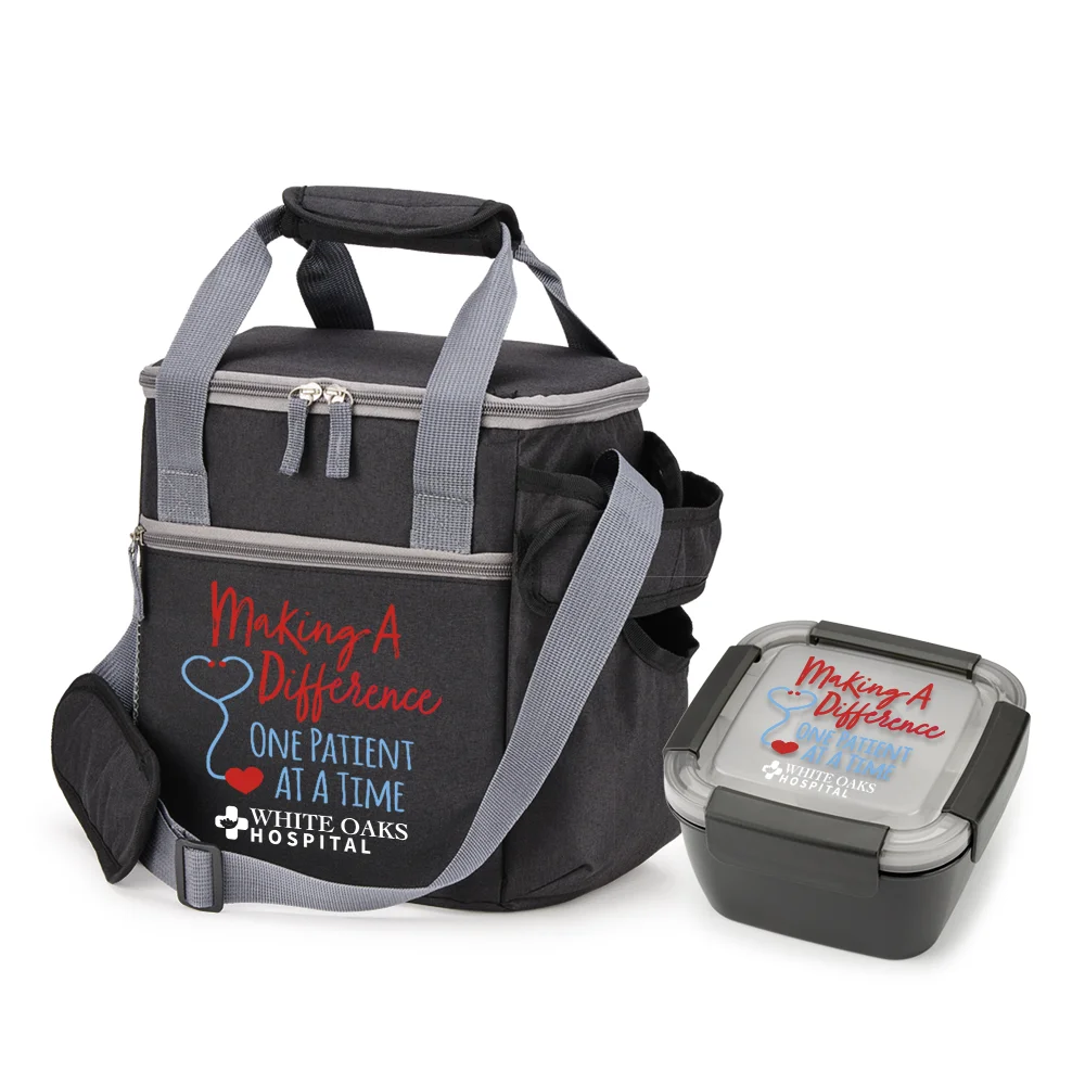 2-piece gift set includes: Riverside Deluxe Lunch/Cooler Bag With 30-/40-oz. Tumbler Pocket & Locking Food Container With Compartments 54 oz.