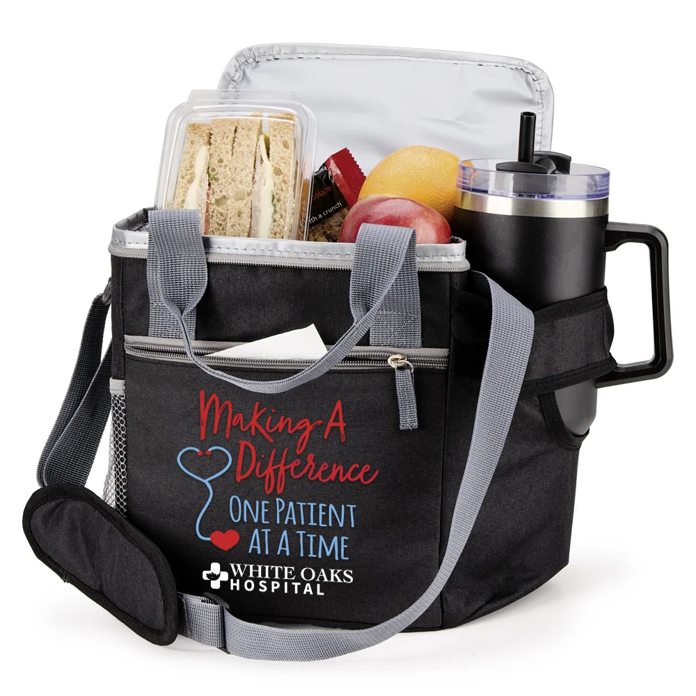 Personalized Lunch/Cooler Bag: Dual-zip, insulated main compartment keeps contents colder (or warmer) longer; Mesh pocket inside lid; Front zip pocket stashes napkins and other items; Side mesh pocket for a water bottle, utensils, and more; Additional adjustable side pocket totes up to a 30-/40-oz. bottle or tumbler; Two carry options: comfort-wrapped handles or padded, adjustable shoulder strap; Holds up to 9 cans; ID window on back; Heathered 600-denier polyester