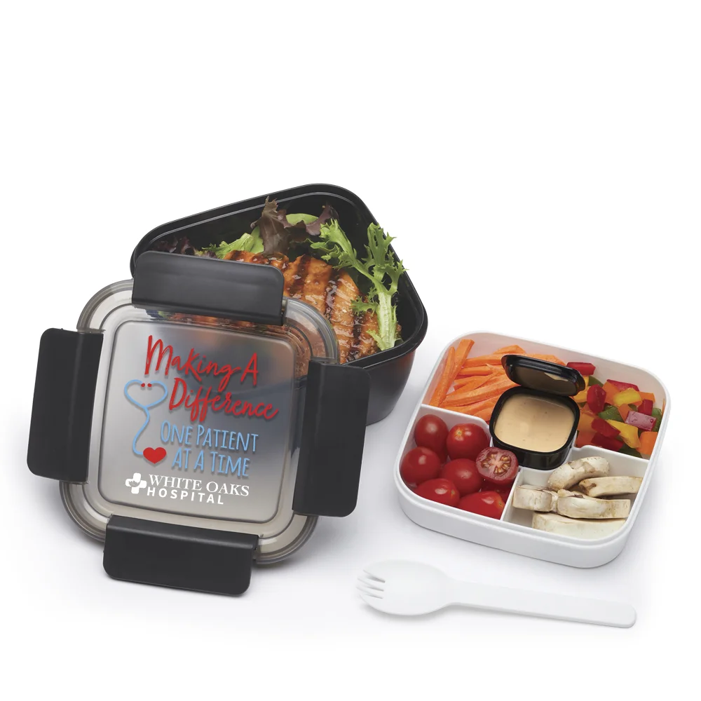 Personalized Food Container: Travel-friendly food container keeps entire meal fresh and organized; Plastic and silicone construction with hinged locking tabs creates an airtight, spill-resistant lid; Entree-sized bottom compartment holds 54 oz. (6.75 cups); Multi-compartment tray separates fruits, veggies, and sides; Sits on top of large compartment; Removable, lidded container in center holds 3 oz. of toppings, dips, or dressing; Included reusable fork tucks neatly inside; Eco friendly; BPA free; Note: Freezer, microwave, and dishwasher safe