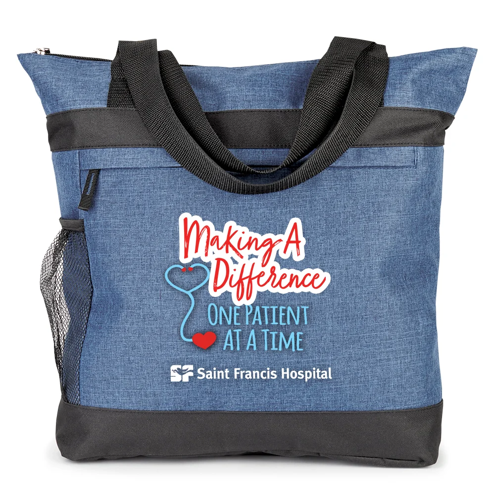 Personalized Tote Bag: Worry-free, carry-everything bag has a hidden zipper to keep valuables secure on the go; Spacious main zip compartment; Front pocket with concealed zipper carries a tablet or their "extras" with extra security; Side mesh pocket for water bottle or umbrella; Easy-carry 25" shoulder straps; Heathered 600-denier polycanvas