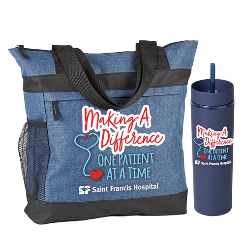 2-piece gift set includes: Dylan Heathered Zip Tote Bag & Canyon 2-in-1 Tumbler & Sipper 16 oz.