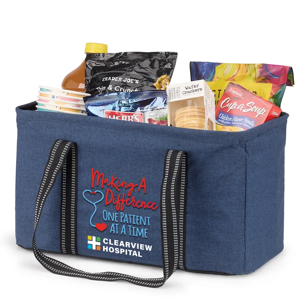 Personalized Tote: Large main compartment with wire rim to hold its shape; Collapses flat for easy storage; Stable base makes it easy to load and unload; Carries groceries, clothing, and daily essentials; Dual 33.5" black web carry handles; 600-denier polyester