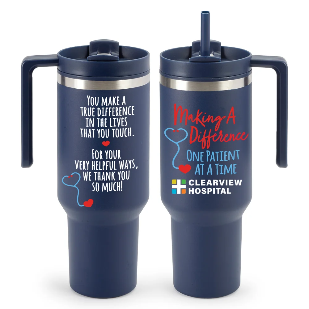 Personalized 40-oz. Tumbler: Double-wall insulated tumbler: stainless-steel outer and plastic liner; Maintains optimal hot or cold temperature; Splash-proof, threaded, 3-position rotating lid: Straw opening with included reusable straw, drink opening, & fully sealed; Sturdy handle for a sure grip; Tapered base fits most car cup holders; Eco friendly; Reusable; BPA free; Appreciation verse on the back; Note: Tumbler: Hand-wash only; Straw: Dishwasher safe
