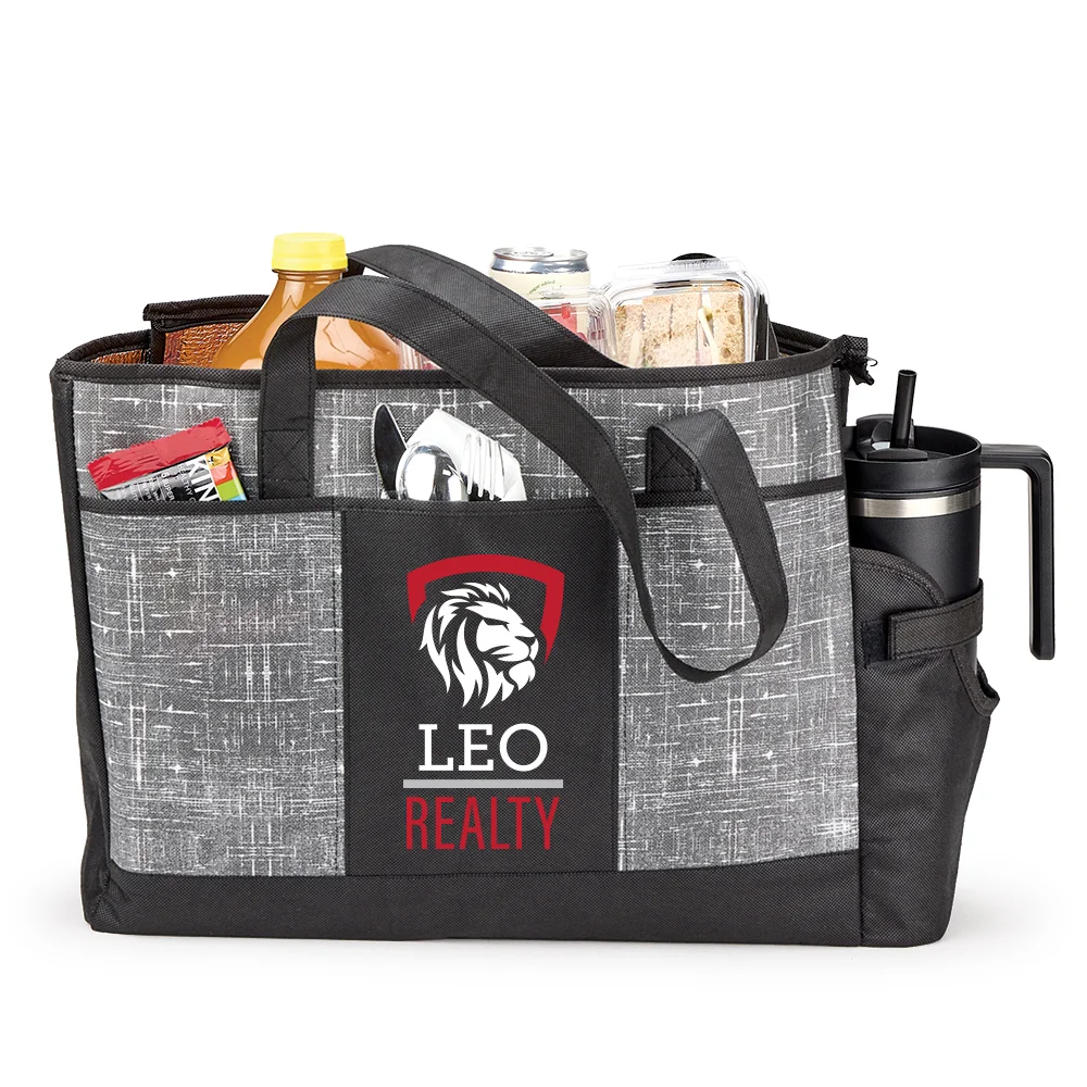 Personalized Cooler Tote: Spacious, insulated interior; Secure zip closure; 3 front pockets store even more; Deep side pocket with adjustable closure for their own bottle or tumbler up to 30/40 oz., with or without handle (tumbler not included); Reinforced shoulder straps for comfy carry; Eco-friendly 80-g. non-woven fabric with foil-lined insulation; Holds up to 18 cans plus ice