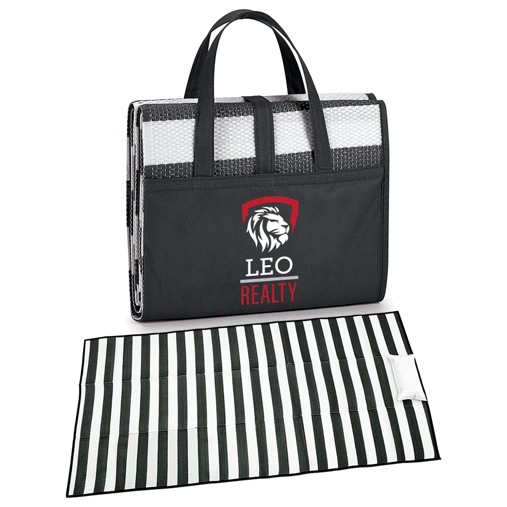 Personalized Beach Mat: Bask in the sun in style and comfort; Perfect for a day at the beach or a picnic in the park; Water- and sand-resistant mat unrolls to 6 feet; Comes with an inflatable pillow for added comfort; Polypropylene with self-attached, non-woven cloth cover; Portable; Easily folds into a convenient case with 17" carry handles for storage and transportation