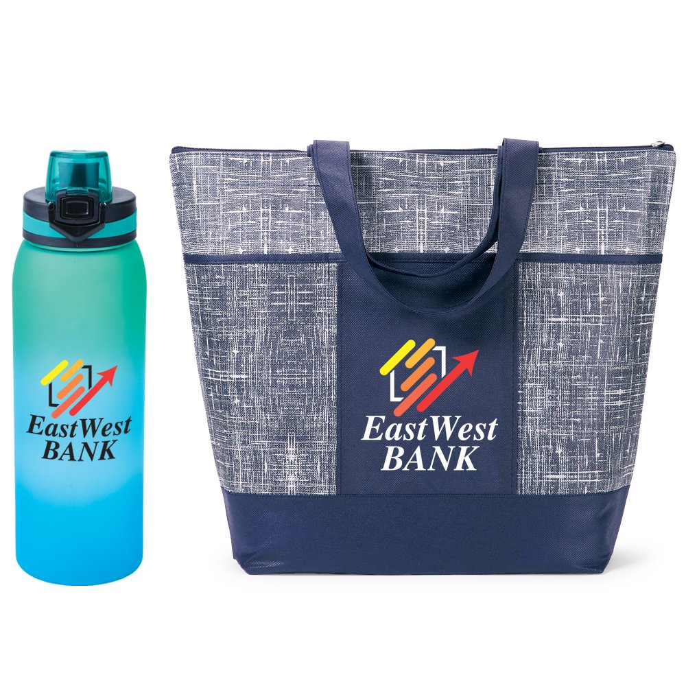2-piece gift set includes: Malibu Non-Woven Zippered Tote Bag & Jasper Ombre Tritan™ Water Bottle 32 oz.