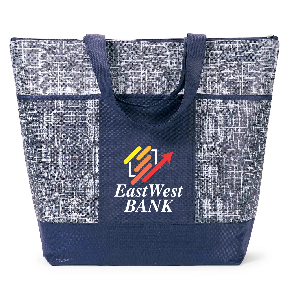 Personalized Tote Bag: Carryall with distressed "denim" look and solid accents; Stylish, reusable alternative to single-use bags; Secure, zip-top tote with generous 5" bottom gusset; Three front pockets for grab-and-go essentials; Reinforced shoulder straps: Dual 25 1/4" carry handles in solid color coordinate with trendy distressed-look denim pattern; Non-woven polypropylene is eco friendly and recyclable; Reusable