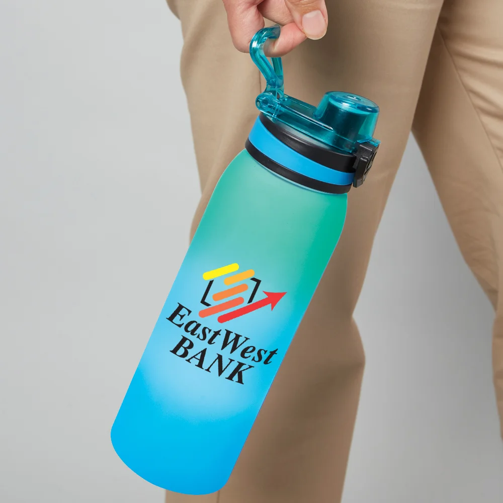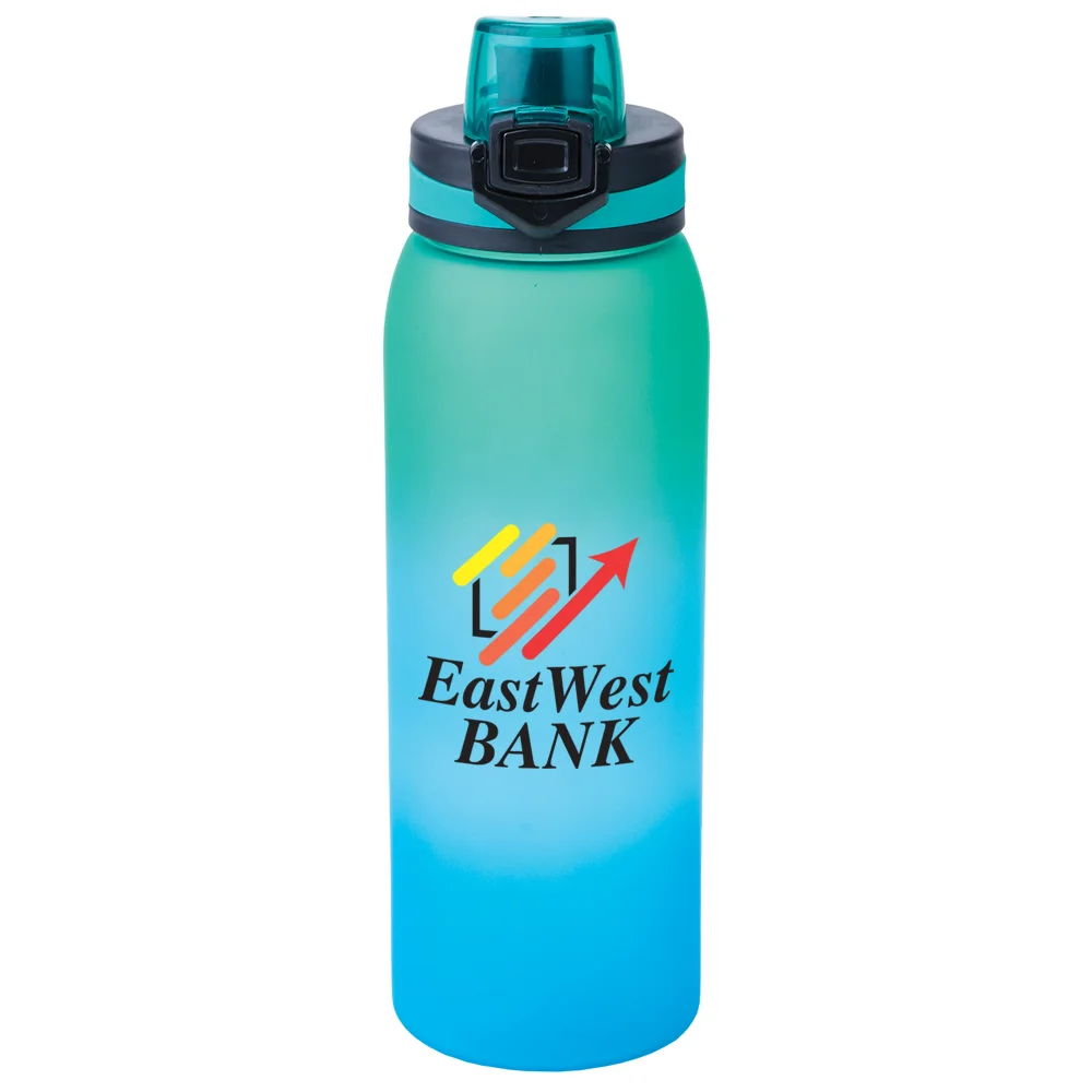Personalized 32-oz. Water Bottle: Lightweight, durable Tritan™ will not absorb or retain odors; Pop-up, leak-proof, locking lid with silicone band coordinates with the ombre colors; Flips up at the touch of a button to access sipper spout; Removable strainer beneath lid prevents seeds and pulp from being swallowed; Flavor water healthfully & naturally with fruit, herbs, or veggies; Easy-carry finger loop at back of lid; Eco friendly; Reusable; BPA free; Note: Hand wash recommended