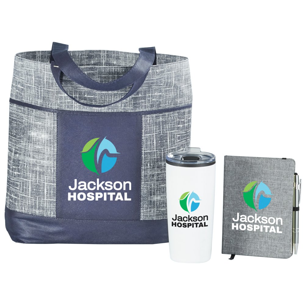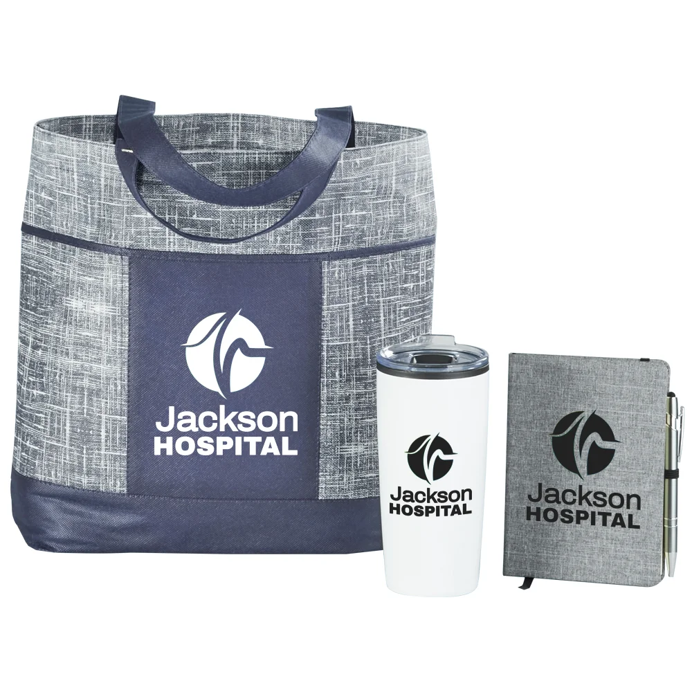 3-piece set includes: Malibu Non-Woven Tote Bag, Teton Stainless-Steel Tumbler 20-Oz., & Heathered Journal With Quotes & Stylus Pen
