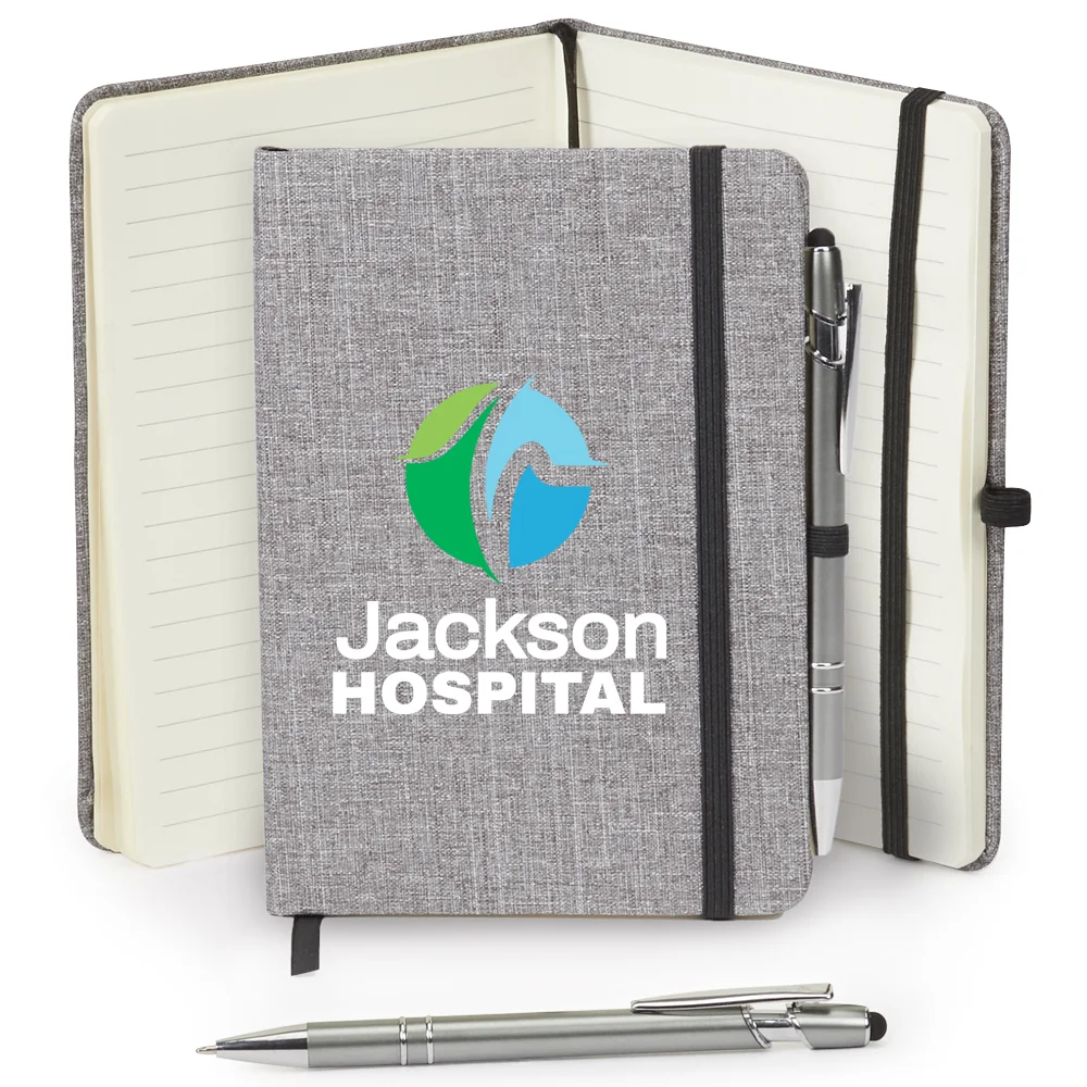 Personalized Journal & Stylus: Heathered, linen-like hard cover; Ribbon bookmark, elastic closure, and elastic pen loop; Stylus Pen included for note-taking and touchscreen navigation; Black ink; 80 lined pages; Includes inspirational quotes on the top of each right page