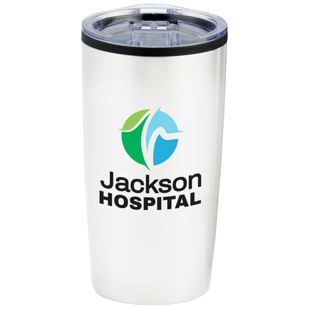 Personalized 20-Oz. Tumbler: Double-wall insulated: stainless-steel exterior with a polypropylene liner; Keeps drinks hot or cold for several hours; Snap-on, spill-resistant, thumb-slide lid with rubber gasket; Eco friendly; BPA free; Reusable; Holds 18 oz. with lid on, 20 oz. with lid removed; Appreciation message on back; Note: Do not microwave; Hand wash recommended