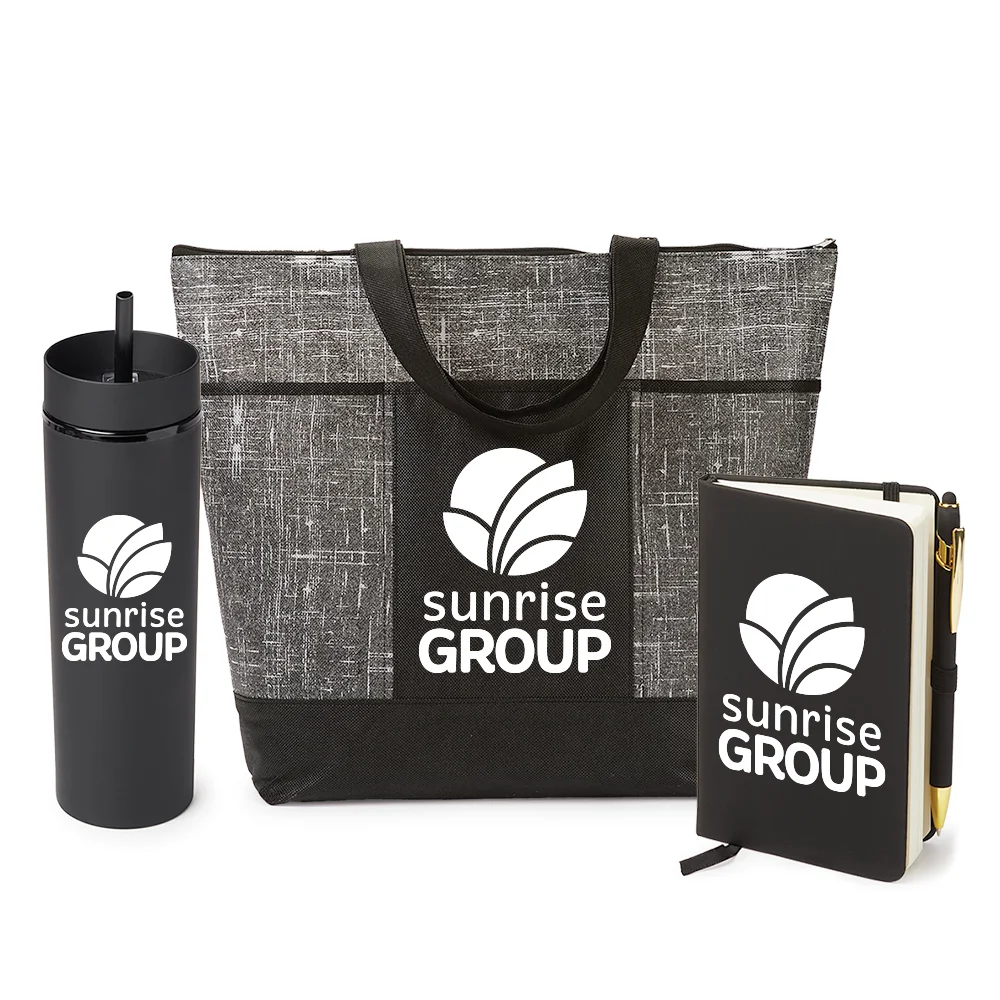 3-piece gift set includes: Malibu Non-Woven Zippered Tote Bag, Canyon 2-in-1 Tumbler & Sipper 16 oz., & Stanton Jotter With Sticky Notes & Stylus Pen