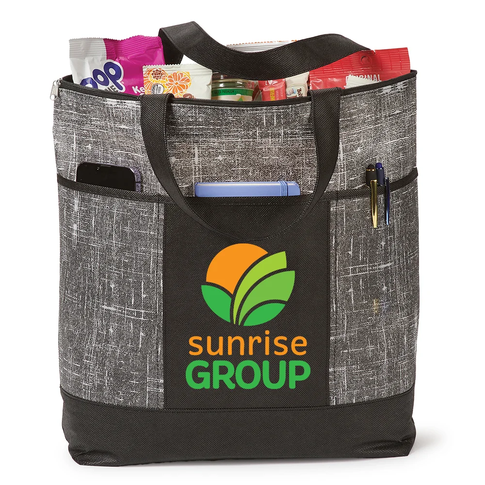 Personalized Tote Bag: Carryall with distressed "denim" look and solid accents; Stylish, reusable alternative to single-use bags; Secure, zip-top tote with generous 5" bottom gusset; Three front pockets for grab-and-go essentials; Reinforced shoulder straps: Dual 25 1/4" carry handles in solid color coordinate with trendy distressed-look denim pattern; Non-woven polypropylene is eco friendly and recyclable; Reusable