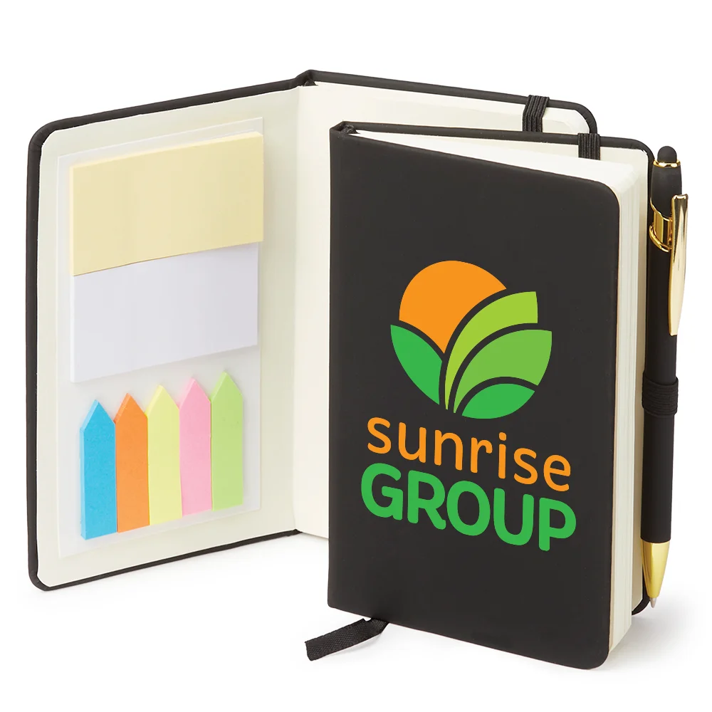 Personalized Jotter: Padded, soft-touch, leather-like hard cover; 80 lined pages; Two 2.75" x 1.25" sticky pads & five 1.75" x 1.5" neon sticky flag pads (25 each of 5 colors; 125 flags total) inside cover; Ribbon page marker; Elastic strap closure; Elastic pen loop; Included metal stylus pen with smooth, rubberized finish and gold accents; Black ink