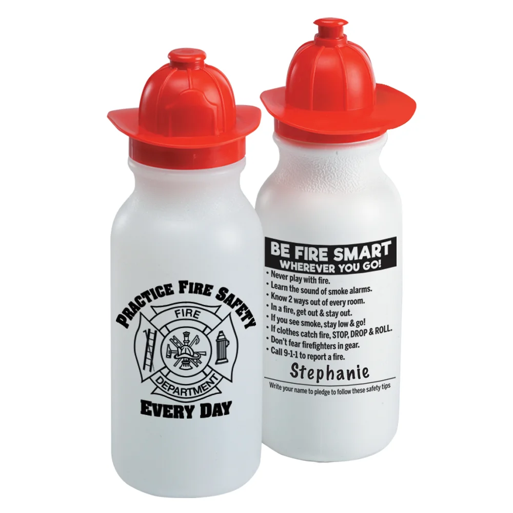 20-Oz. Fire Helmet Water Bottle:Practice Fire Safety Every Day on front; Fire-safety tips on back; Push-pull lid; Eco friendly; Reusable; BPA free