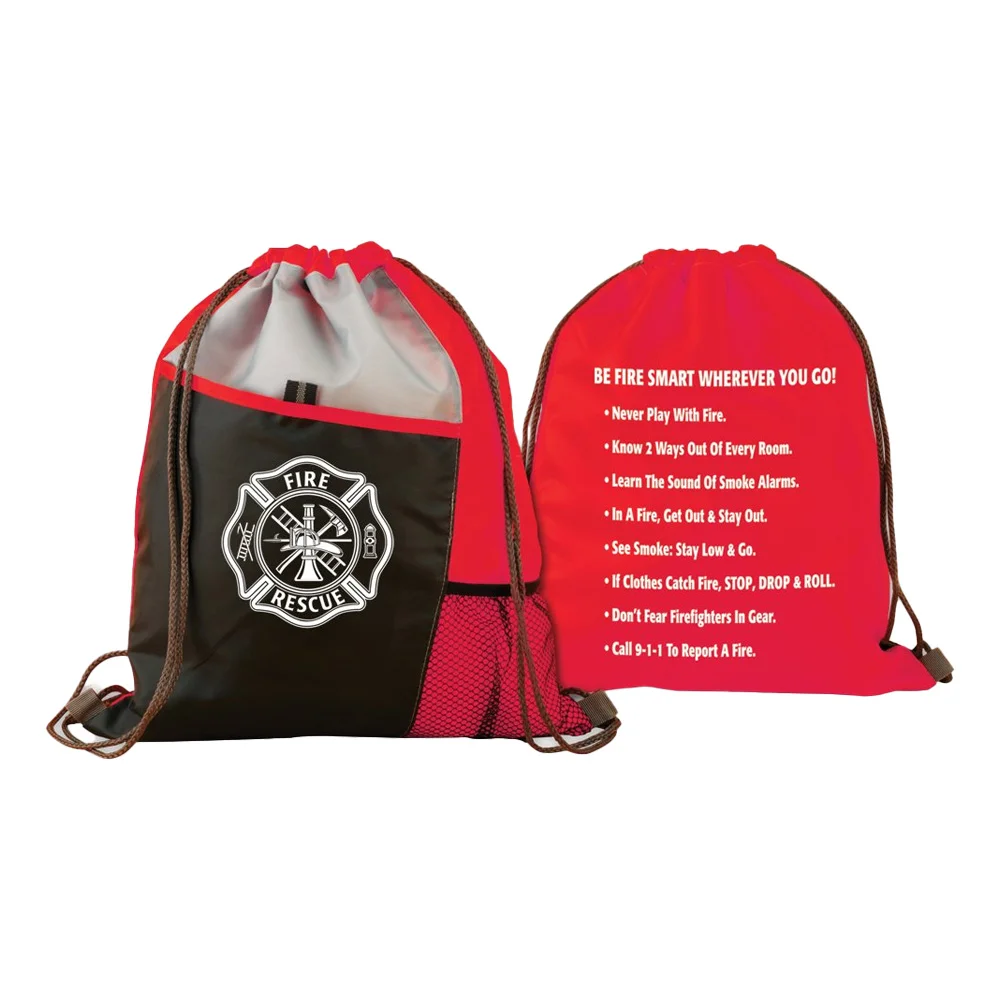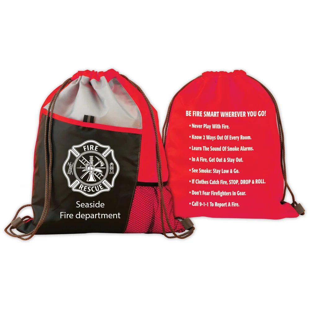 Personalized Deluxe Drawstring Backpack: Cinch up and carry on shoulders; Large front pocket, large mesh side pocket, and pen loop; Reflective safety strip for visibility at night; Maltese Cross design on front; Fire-safety tips on back