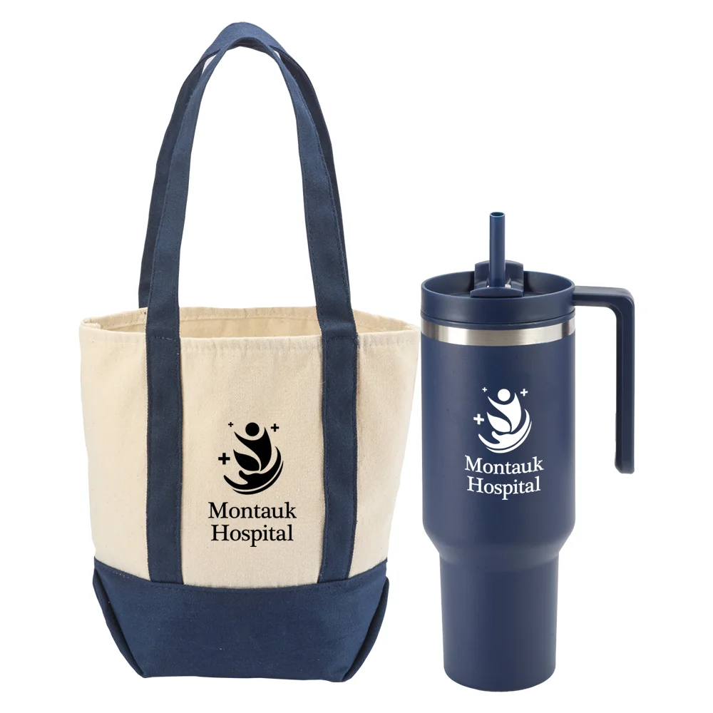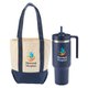 2-piece gift set includes: Cotton Canvas Market Tote Bag & Quencher Stainless-Steel/Plastic-Lined Tumbler 40 oz. With Handle
