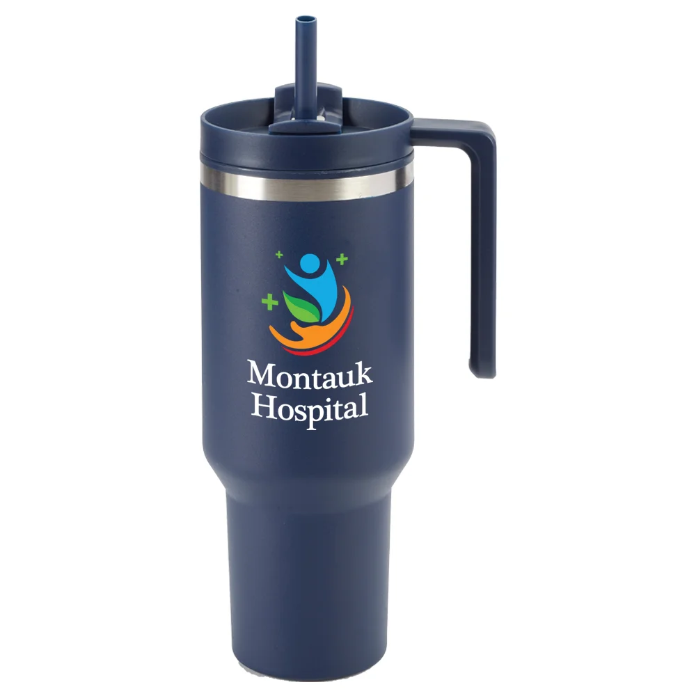 Personalized 40-oz. Tumbler: Double-wall insulated tumbler: stainless-steel outer and plastic liner; Maintains optimal hot or cold temperature; Splash-proof, threaded, 3-position rotating lid: Straw opening with included reusable straw, drink opening, & fully sealed; Sturdy handle for a sure grip; Tapered base fits most car cup holders; Eco friendly; Reusable; BPA free; Note: Tumbler: Hand-wash only; Straw: Dishwasher safe