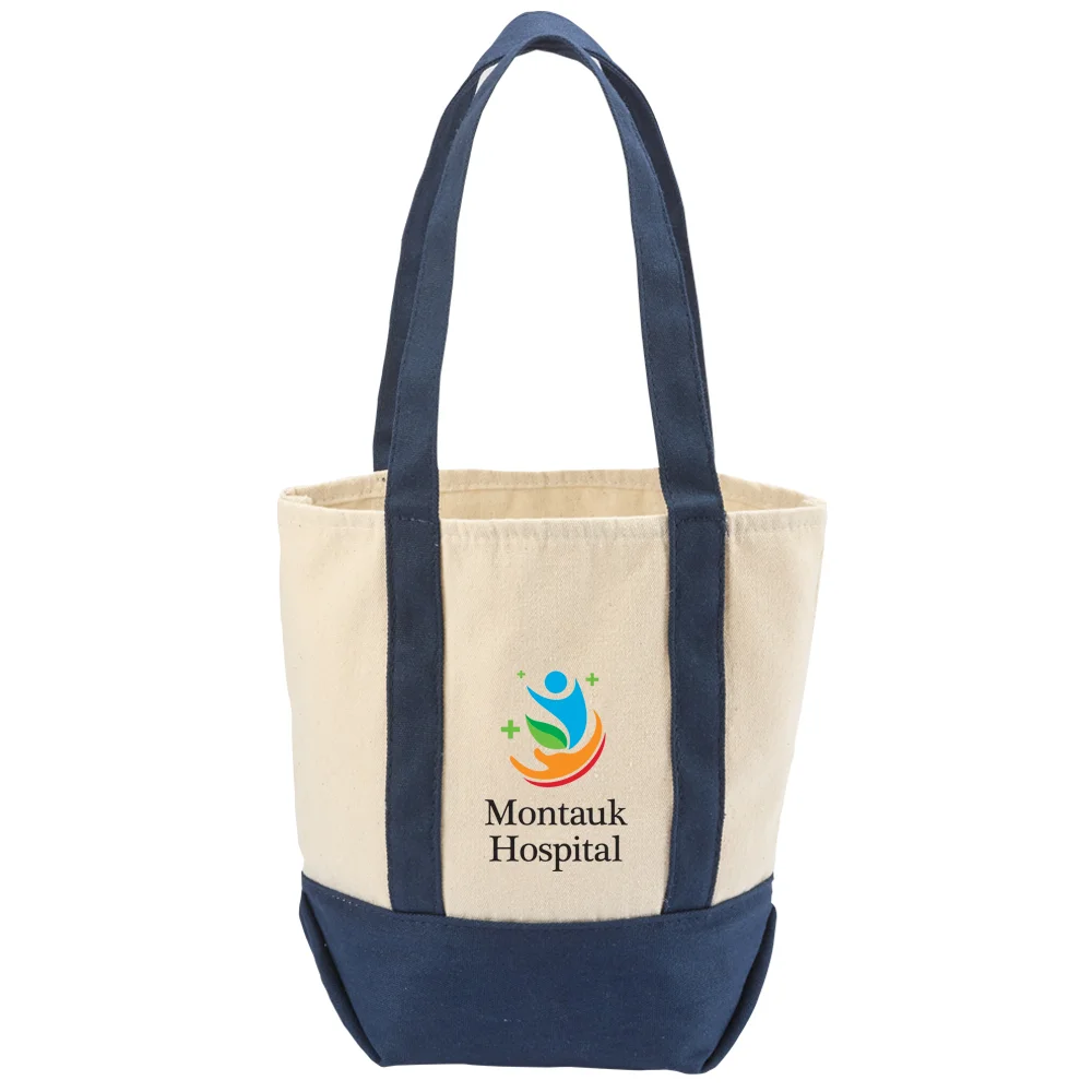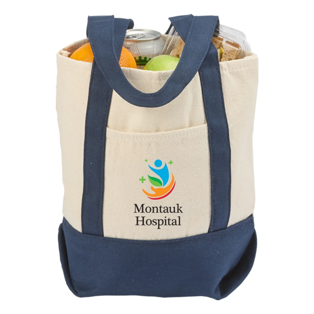 Personalized Cotton Tote: Open-top design; Natural color with contrasting shoulder straps and trim; Easy-access front pocket; 320-gsm. sustainable blend of 70% recycled 10-oz. cotton canvas / 30% polyester; 18" handles fit comfortably over shoulder