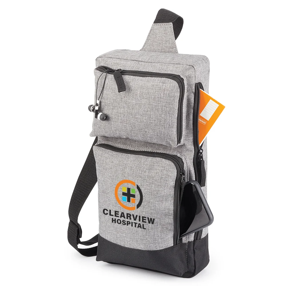 Personalized Sling Bag: Go-everywhere, go-hands-free bag; Sporty with wide, adjustable strap that can be worn across front or back of body or slung over shoulder for carrying ease and comfort; Ergonomic, single-strap design; Roomy interior compartment with vertical side zip opening; Two quick-access exterior zip pockets to keep necessities organized; Heathered 600-denier polyester