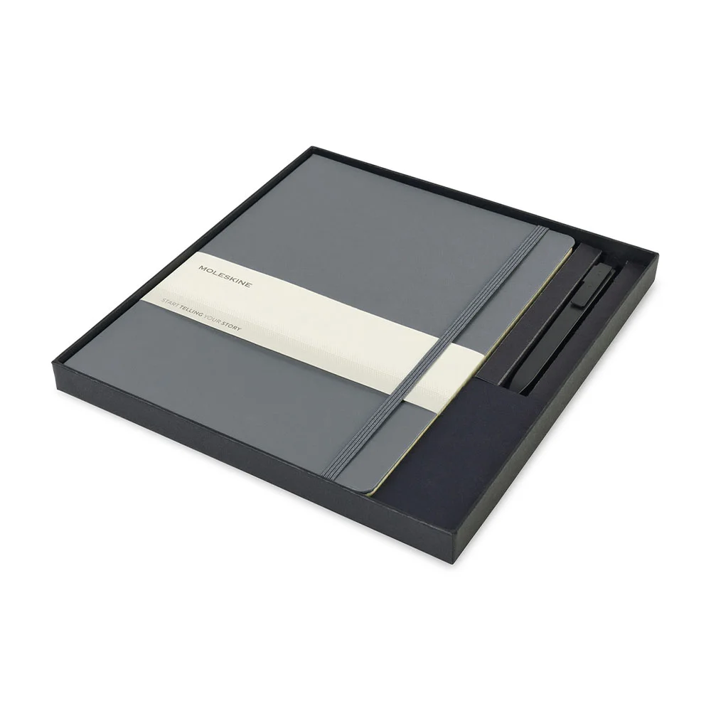 This gift set includes one Hard Cover Ruled X-Large Notebook and one Go Pen packaged in a two-piece Moleskine gift box