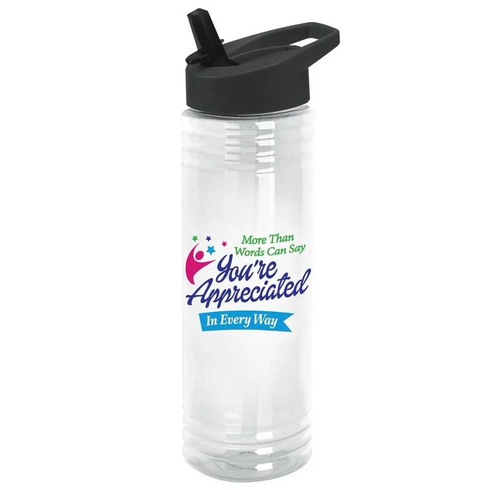 24-Oz. Bottle: Durable, lightweight, plastic sport bottle for healthful, grab-and-go hydration; Pop-up, flip straw spout; Sport sipper lid with integrated carry handle; Wide mouth; Easy to fill with beverage, ice, or powdered drinks; Easy to clean; Eco friendly; BPA free; Reusable; Refill & Repeat hydration reminders on back; Note: Hand wash recommended