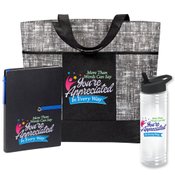 Tote Bag: 17 1/2" X 14 1/2" X 3 1/2", Jotter: 4" X 5 1/2", Pen: 5" L; Ink: Black, Water Bottle: 24-Oz.
