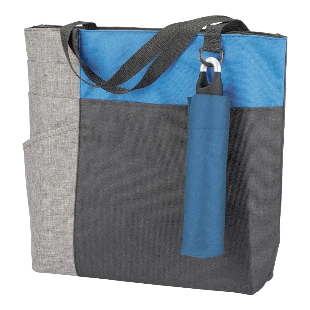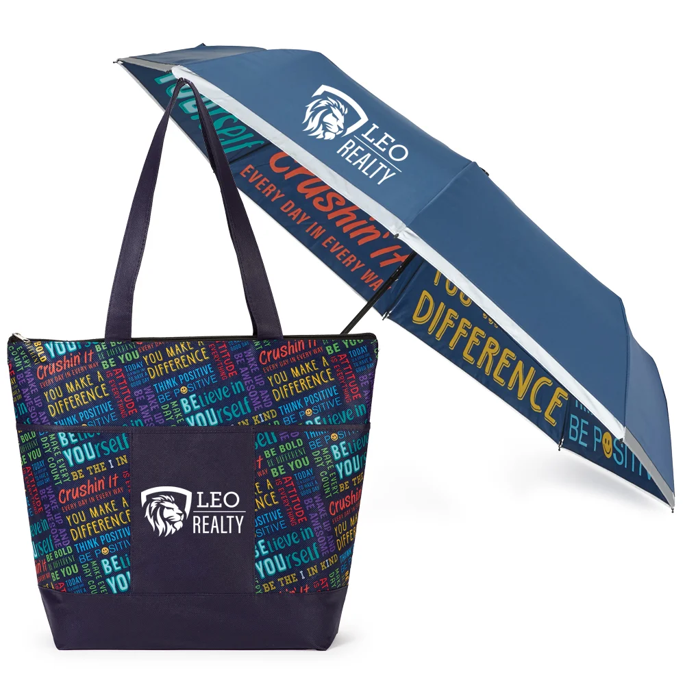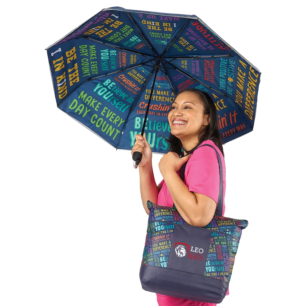 2-piece gift set includes: Motivational Word Cloud Malibu Non-Woven Zippered Tote Bag & 38" Motivational Clip Umbrella With Safety Reflective Trim