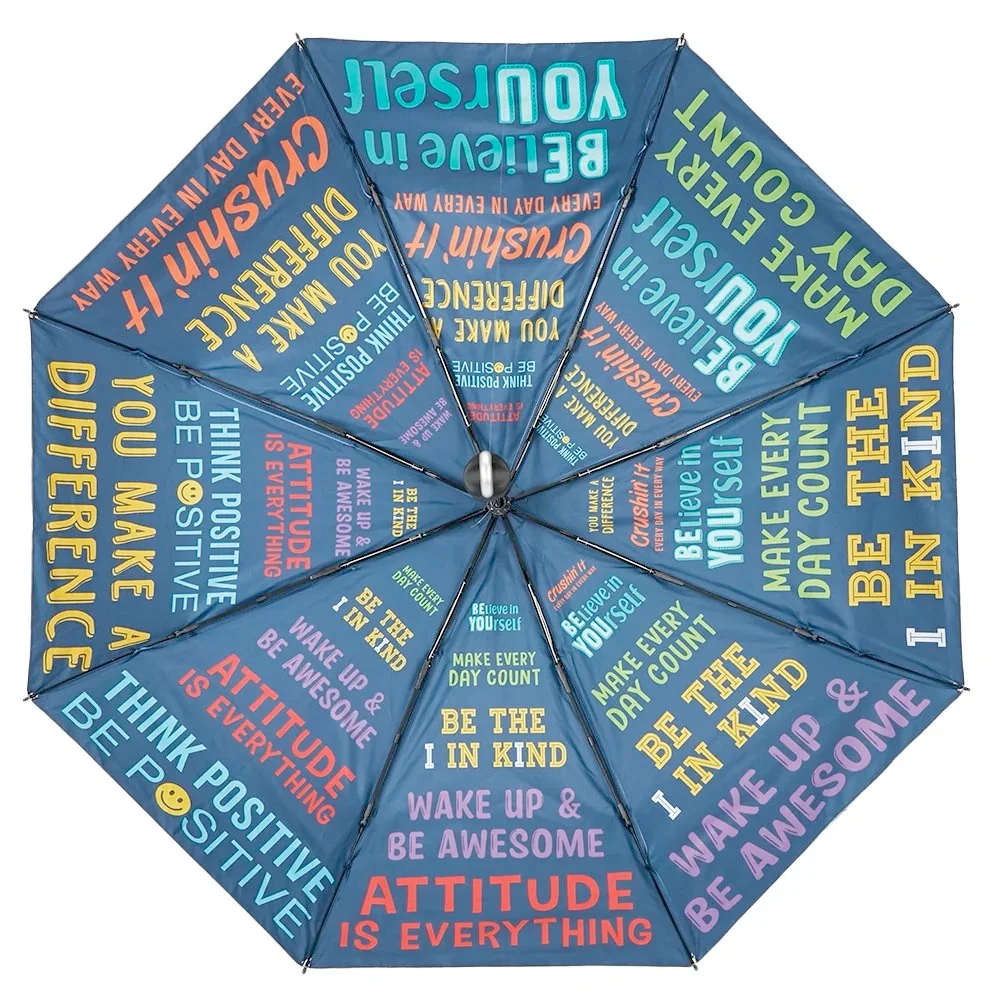 Personalized Umbrella: Compact umbrella with magnetic-closure carabiner clips to any bag for amazing "there-when-they-need-it" convenience; Silver trim around canopy reflects street lights and headlights for safety and visibility on dark or rainy nights; Features a handy clip-on handle; No more lost umbrellas as this one clips right to their bag; Manual open/close; Telescopic metal shaft with rubberized comfort handle folds down to just 11"; Matching-color storage sleeve included; Full-color design with 8 repeating positive messages inside the canopy