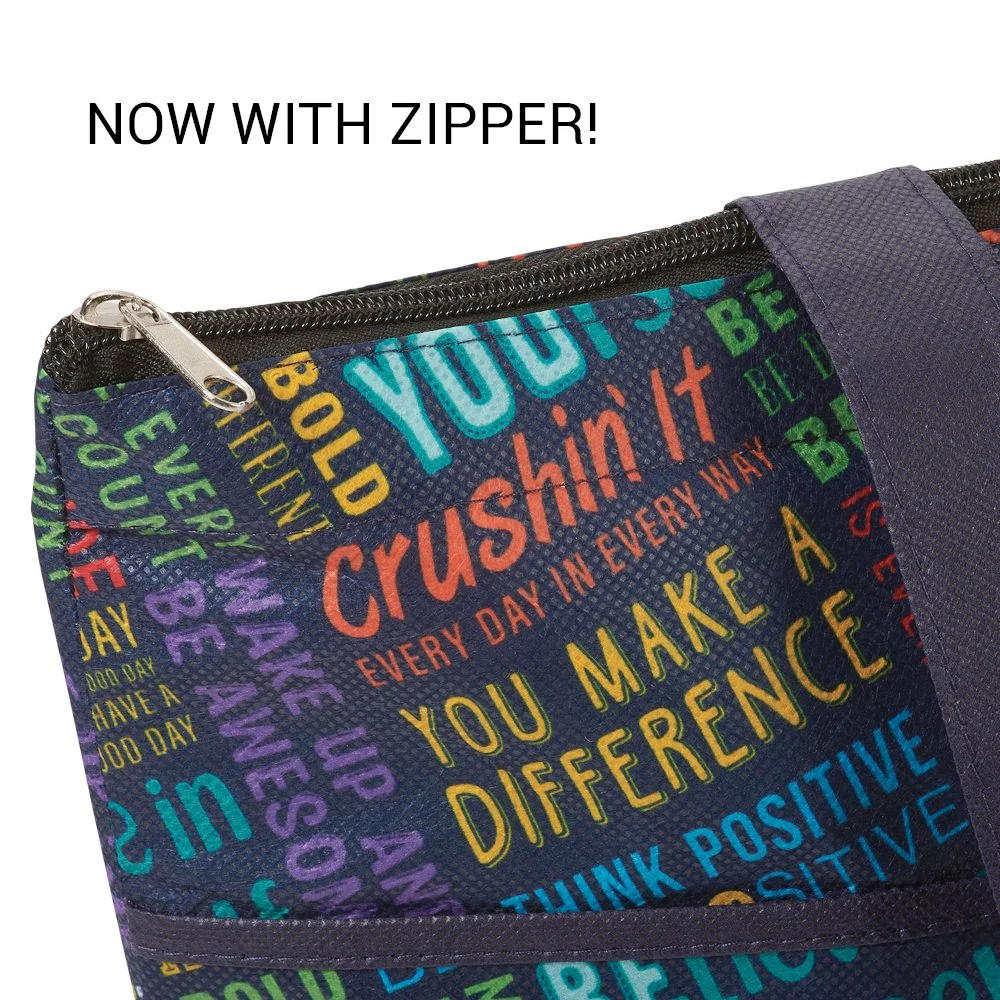 Personalized Tote Bag: Stylish, reusable alternative to single-use bags; Secure, zip-top tote with generous 5" bottom gusset; Three front pockets for grab-and-go essentials; Reinforced shoulder straps: Dual 25 1/4" carry handles in solid color; Non-woven polypropylene is eco friendly and recyclable; Reusable; Features a Motivational Word Cloud pattern of 11 positive messages
