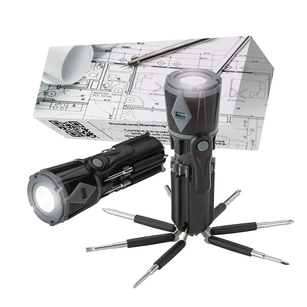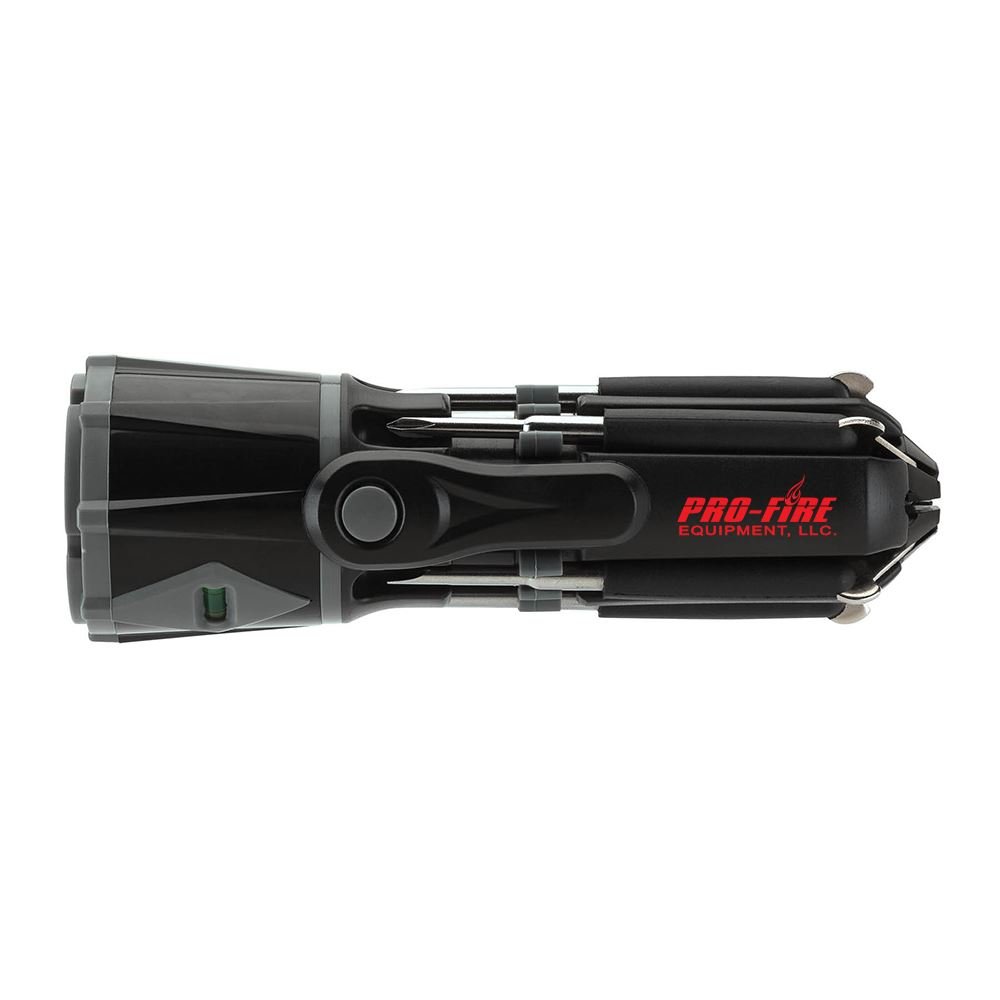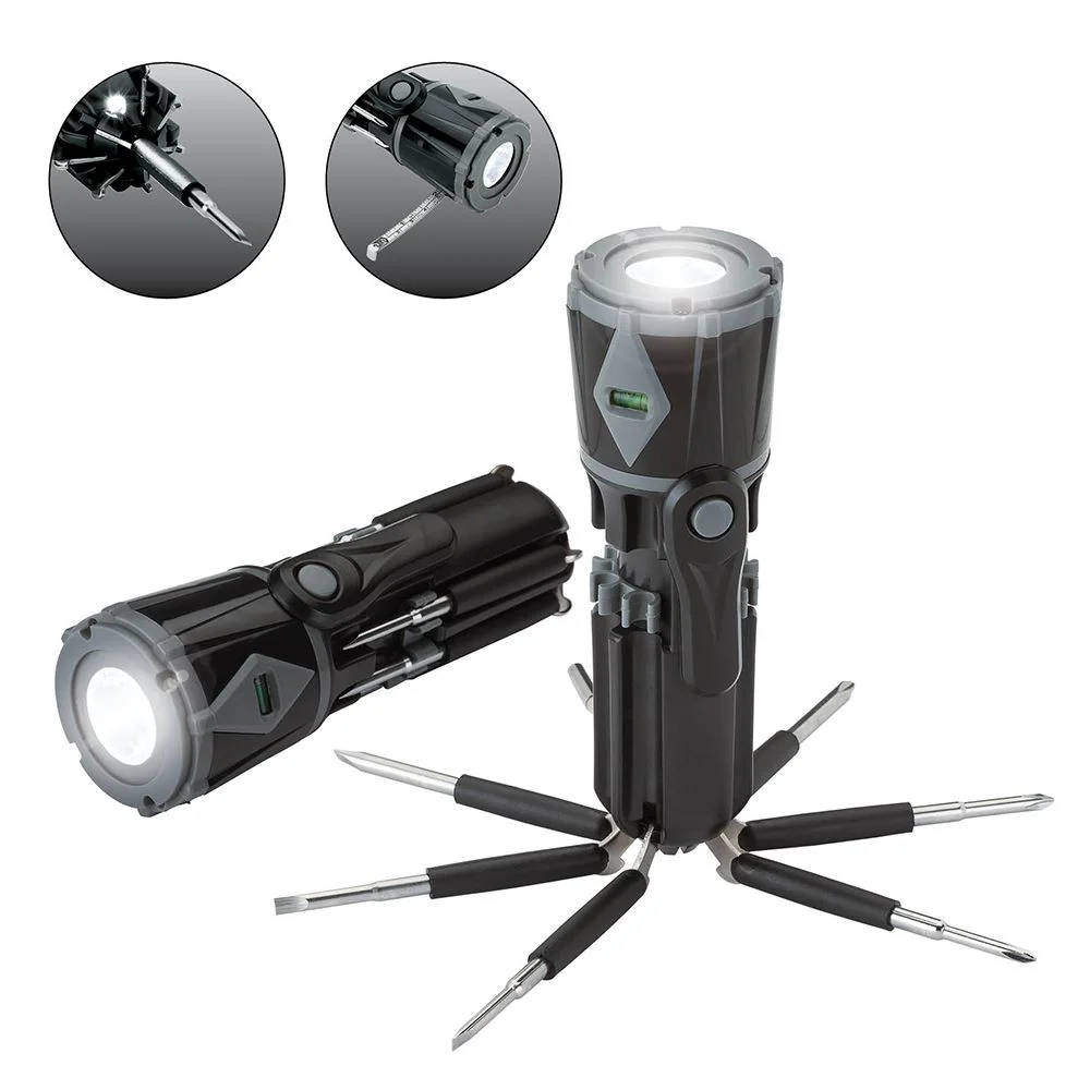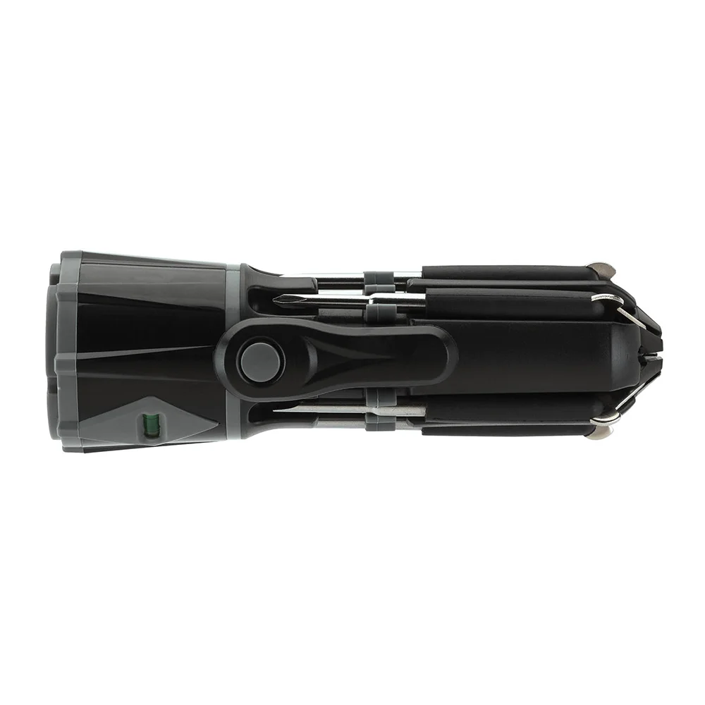 Bright LED flashlight (25 lumens) with on/off switch; Also lights up tool spotlight (15 lumens) on the other end to help you see what you are working on