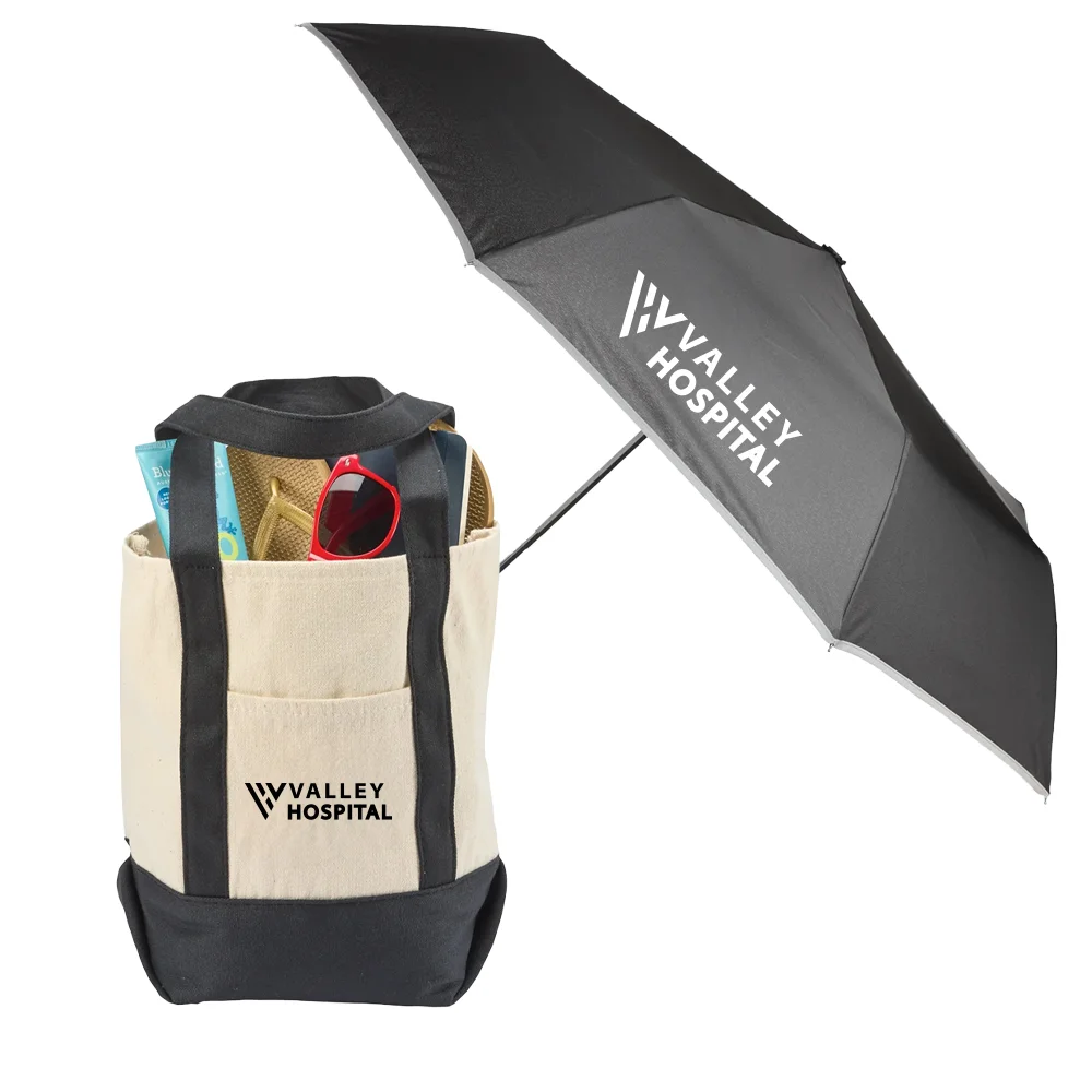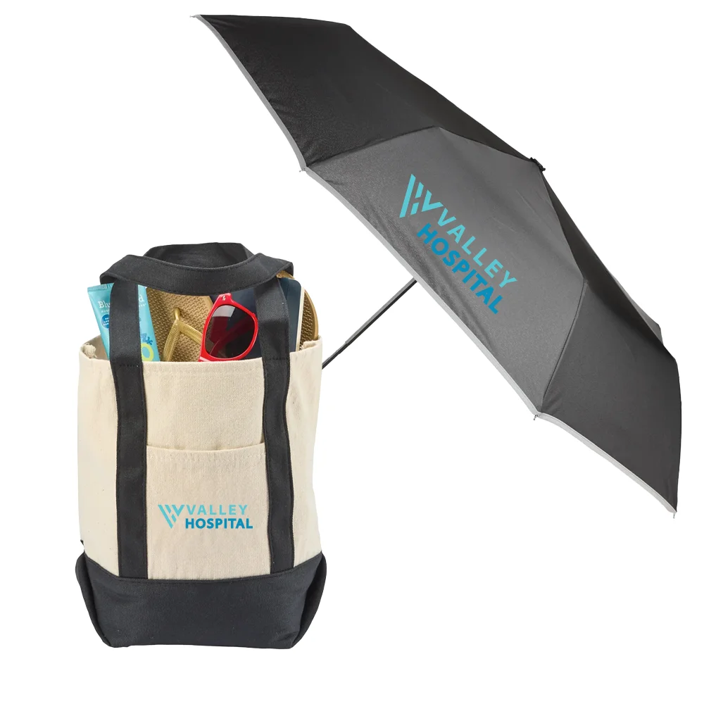 2-piece gift set includes: Cotton Canvas Market Tote Bag & 46" rPET/UV Auto Open/Close Umbrella With Reflective Trim & Carabiner Handle