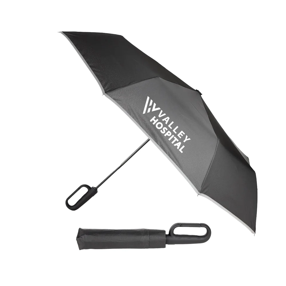 Personalized 46" Umbrella: 8 panels; 46" canopy arc; Fiberglass ribs and frames; Trim reflects street lights and headlights; Push button for one-hand auto open/close; Versatile carabiner handle: easy to grip, clip to a bag, or hang up to dry; Telescoping iron shaft folds for transport; Eco-friendly rPET 190T pongee; PFAS free; C-Zero water-repellent coating (no harmful chemicals); SPF-50 sun protection; High-visibility trim; Matching sleeve included