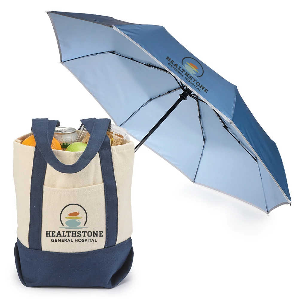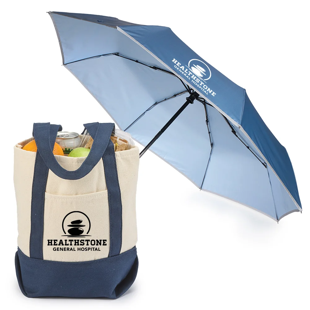 2-piece gift set includes: Cotton Canvas Market Tote Bag & 46" rPET/UV Auto Open/Close Umbrella With Reflective Trim & Carabiner Handle