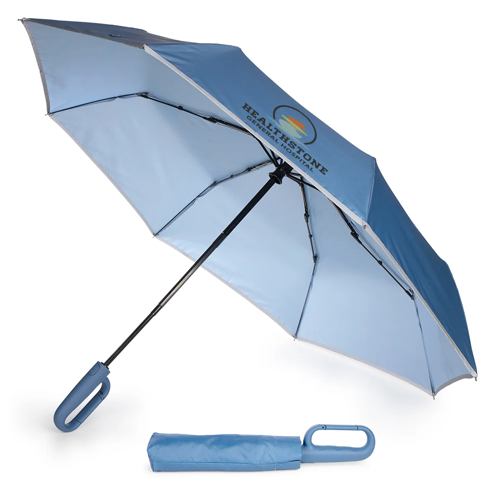 Personalized 46" Umbrella: 8 panels; 46" canopy arc; Fiberglass ribs and frames; Trim reflects street lights and headlights; Push button for one-hand auto open/close; Versatile carabiner handle: easy to grip, clip to a bag, or hang up to dry; Telescoping iron shaft folds for transport; Eco-friendly rPET 190T pongee; PFAS free; C-Zero water-repellent coating (no harmful chemicals); SPF-50 sun protection; High-visibility trim; Matching sleeve included