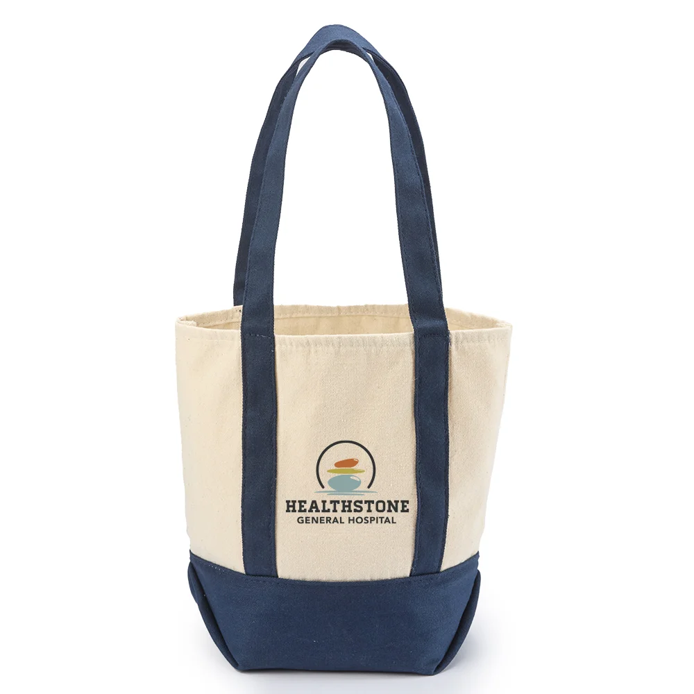 Personalized Cotton Tote: Open-top design; Natural color with contrasting shoulder straps and trim; Easy-access front pocket; 320-gsm. sustainable blend of 70% recycled 10-oz. cotton canvas / 30% polyester; 18" handles fit comfortably over shoulder