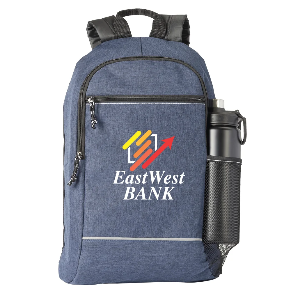 Personalized Backpack: On-trend heathered styling and just the right size for workday or weekend; Front zippered compartment; Top grab handle; Roomy interior; Mesh pocket outside for water bottle, umbrella, and more; Two padded, adjustable backpack straps for carrying comfort; 600-denier polyester with reflective trim for added safety