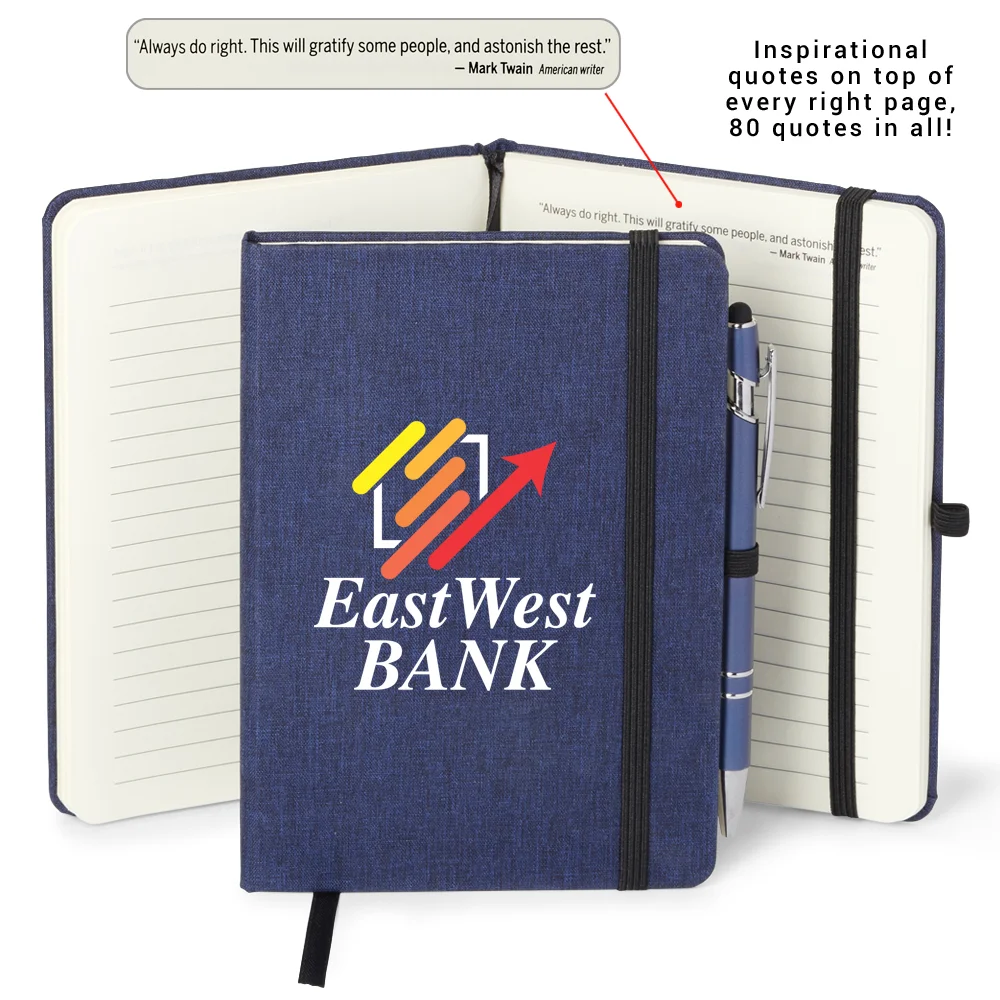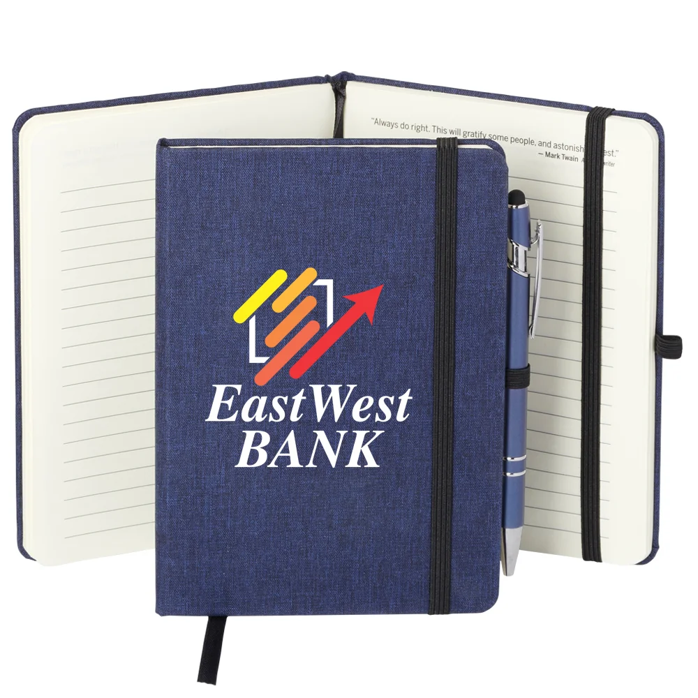 Personalized Journal & Blank Stylus: Heathered, linen-like hard cover; 80 lined pages; Ribbon bookmark, elastic closure, and elastic pen loop; Stylus Pen included for note-taking and touchscreen navigation; Black ink; Note: Pen remains blank