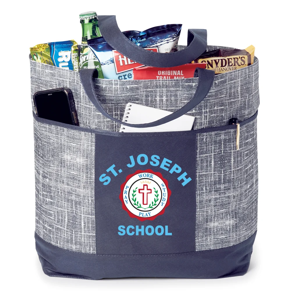 Personalized Tote Bag: Carryall with distressed "denim" look and solid accents; Stylish, reusable alternative to single-use bags; Secure, zip-top tote with generous 5" bottom gusset; Three front pockets for grab-and-go essentials; Reinforced shoulder straps: Dual 25 1/4" carry handles in solid color coordinate with trendy distressed-look denim pattern; Non-woven polypropylene is eco friendly and recyclable; Reusable